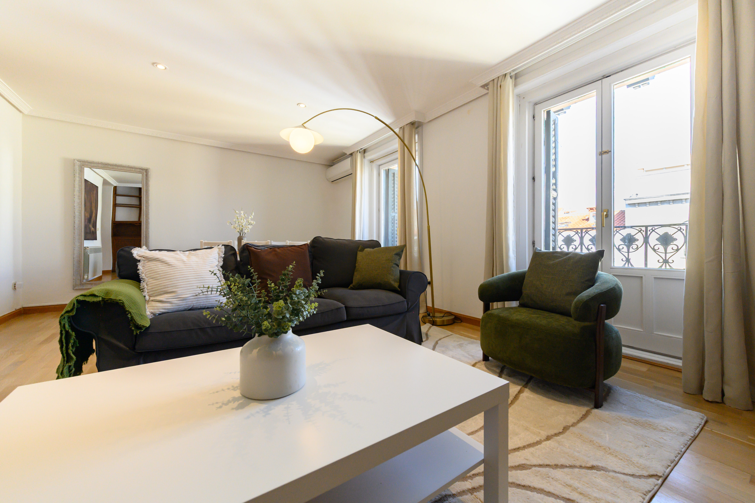 - Large main living room with sofa, TV, armchair, dressers, large dining table, mirror, and balconies with beautiful views and plenty of natural light. It also has air conditioning and heating.