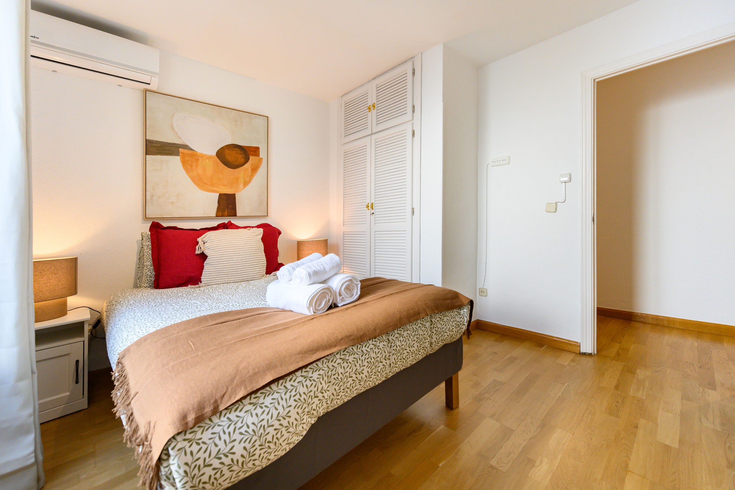 - Bedroom with a double bed, built-in wardrobe, bedside tables, mirror, balcony, air conditioning, and heating.