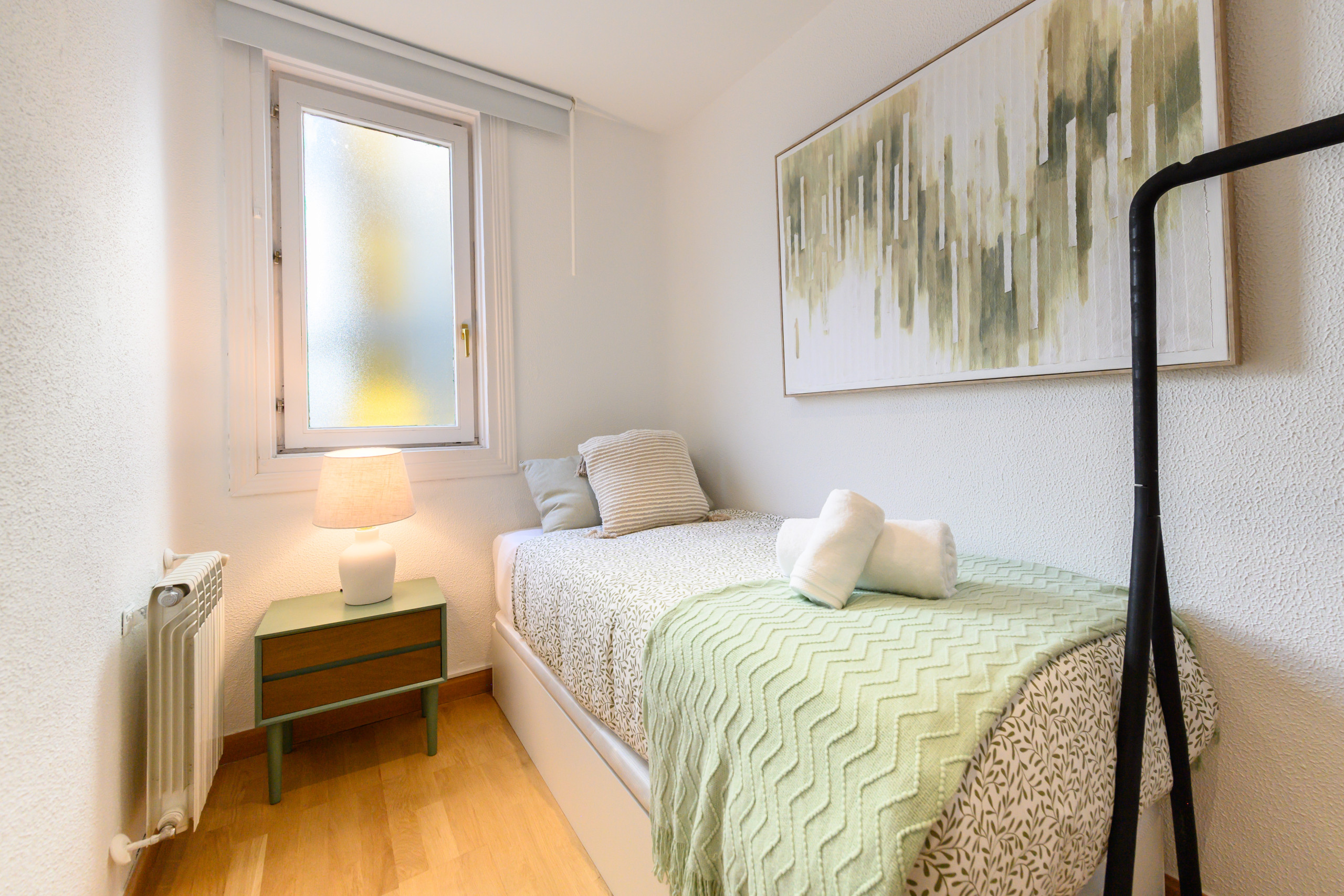 - Second bedroom with a single bed with storage underneath, bedside table, and clothes rack.
