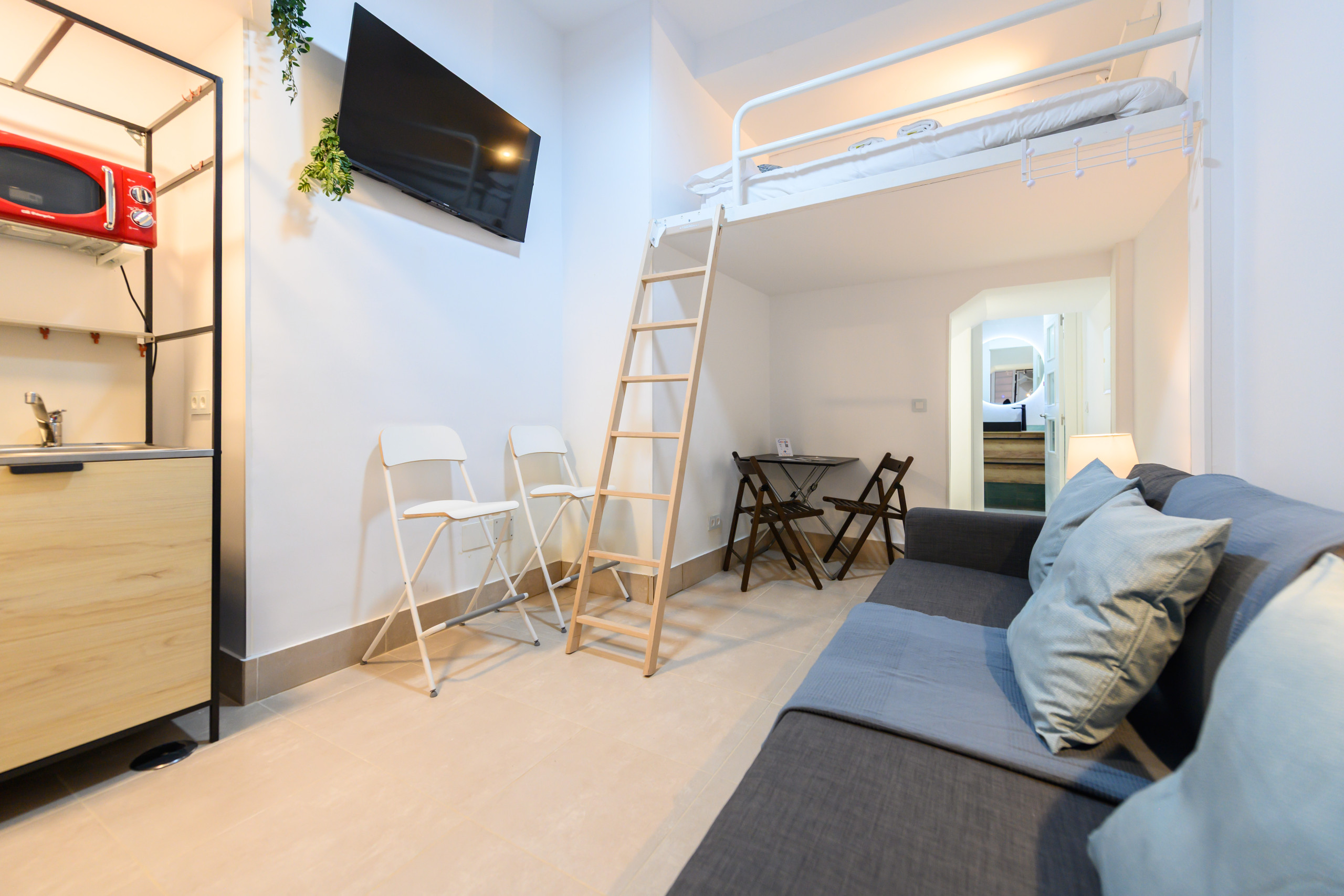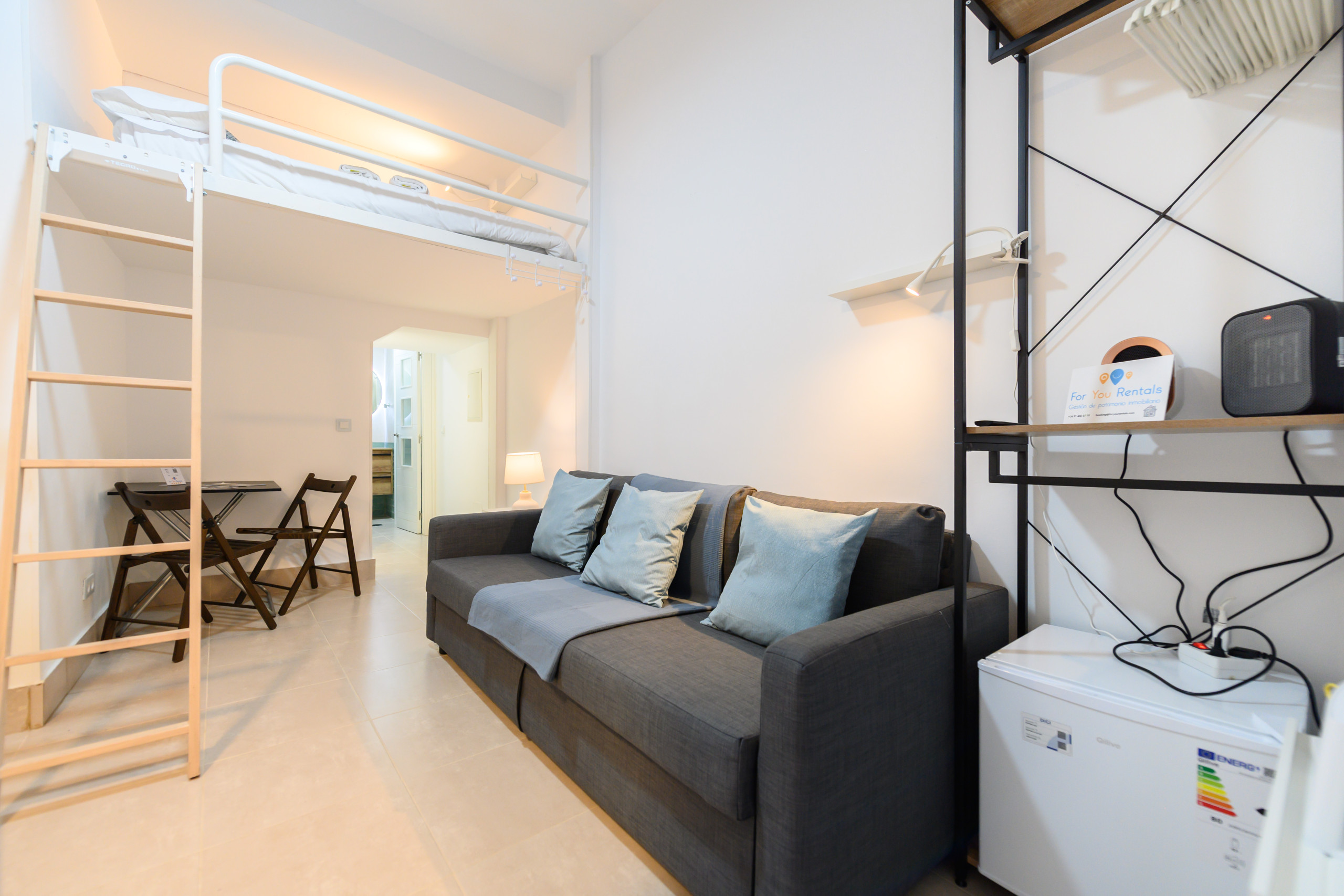 The apartment is a well-distributed duplex. It has a double bed upstairs, a full bathroom equipped with a shower, vanity unit with storage space, and a mirror. The kitchen is equipped with a refrigerator, microwave, and cooking utensils, ideal for preparing meals during your stay. The living room has a comfortable sofa that converts into a double sofa bed, a television, and a table, creating a cozy and functional space to relax or spend time together. The apartment also has air conditioning and heating, guaranteeing a comfortable temperature year-round.