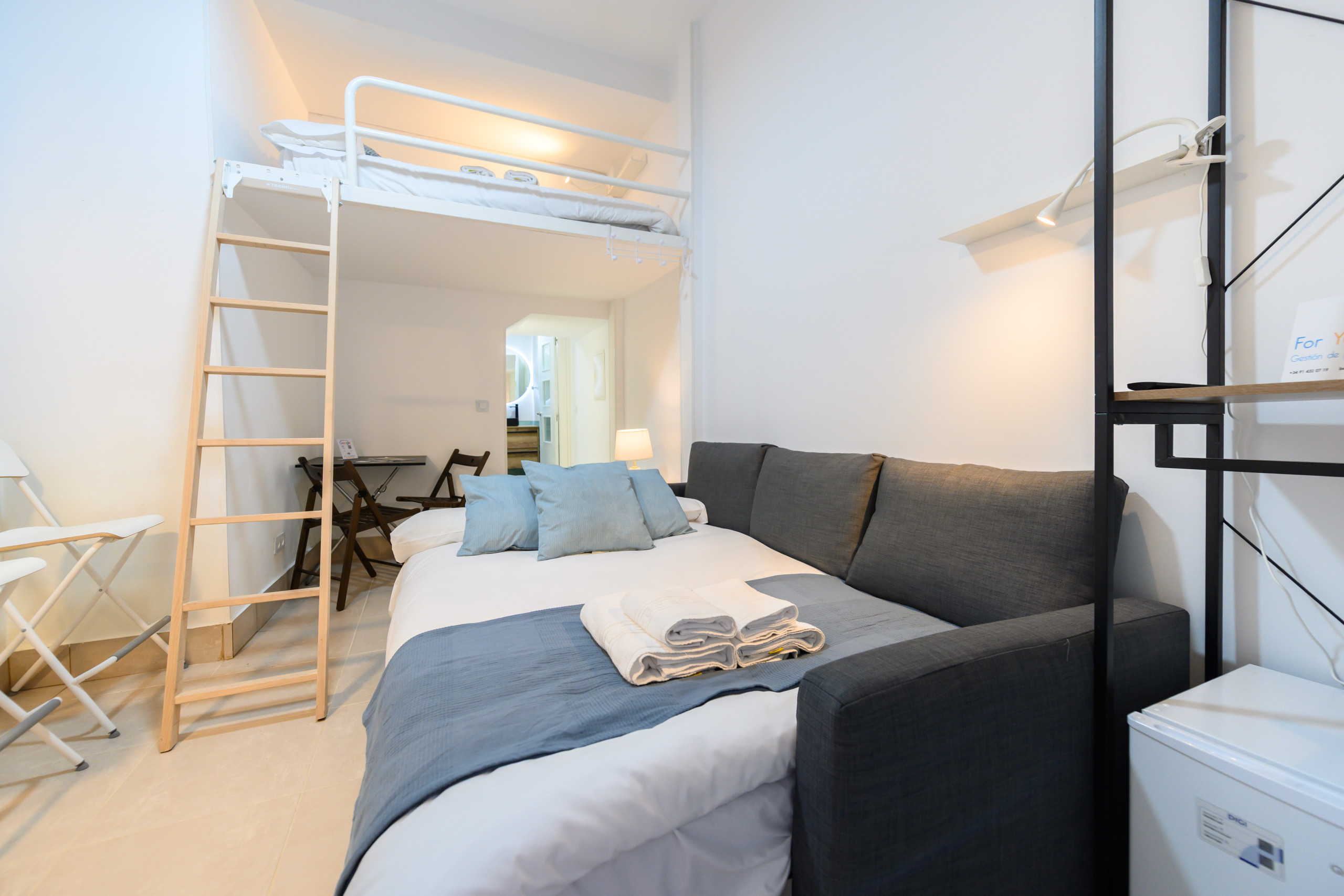 • Living area: Common area with a sofa bed, table, chest of drawers, television, built-in wardrobe, and good natural light.