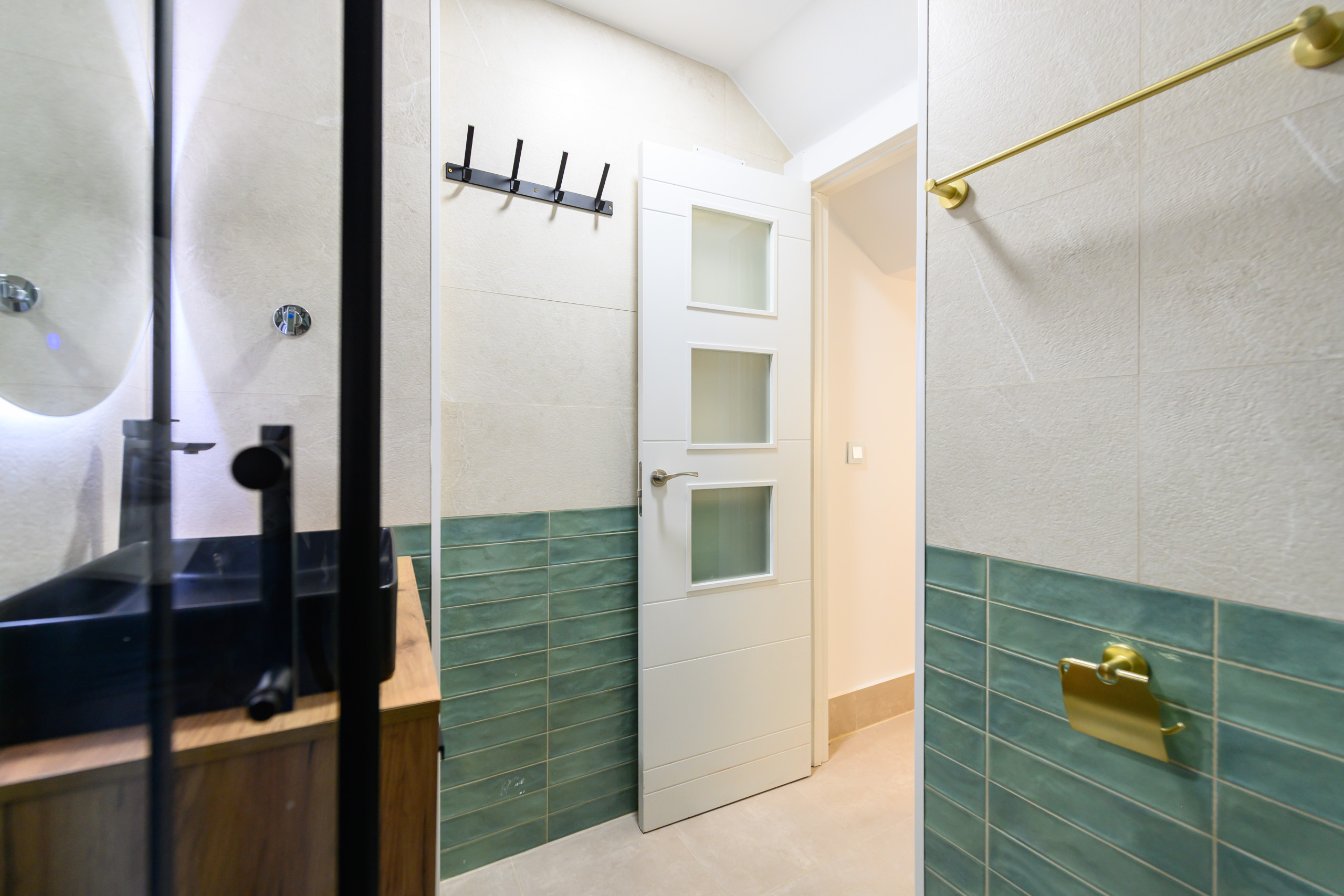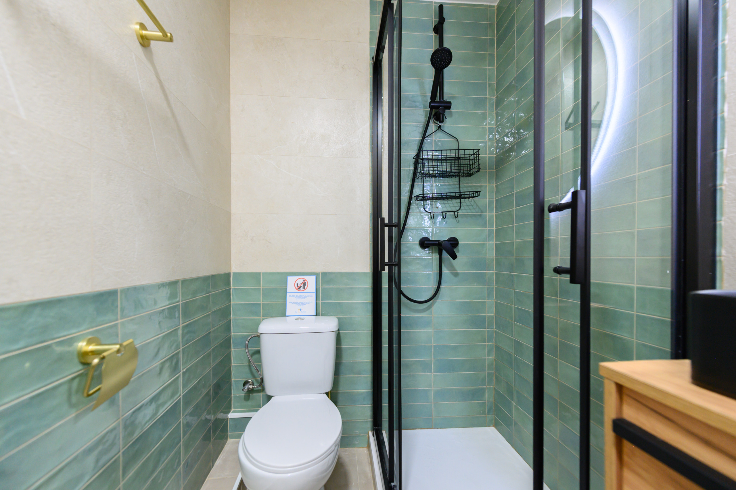 • Bathroom: Toilet, shower, mirror, washing machine, and storage space.