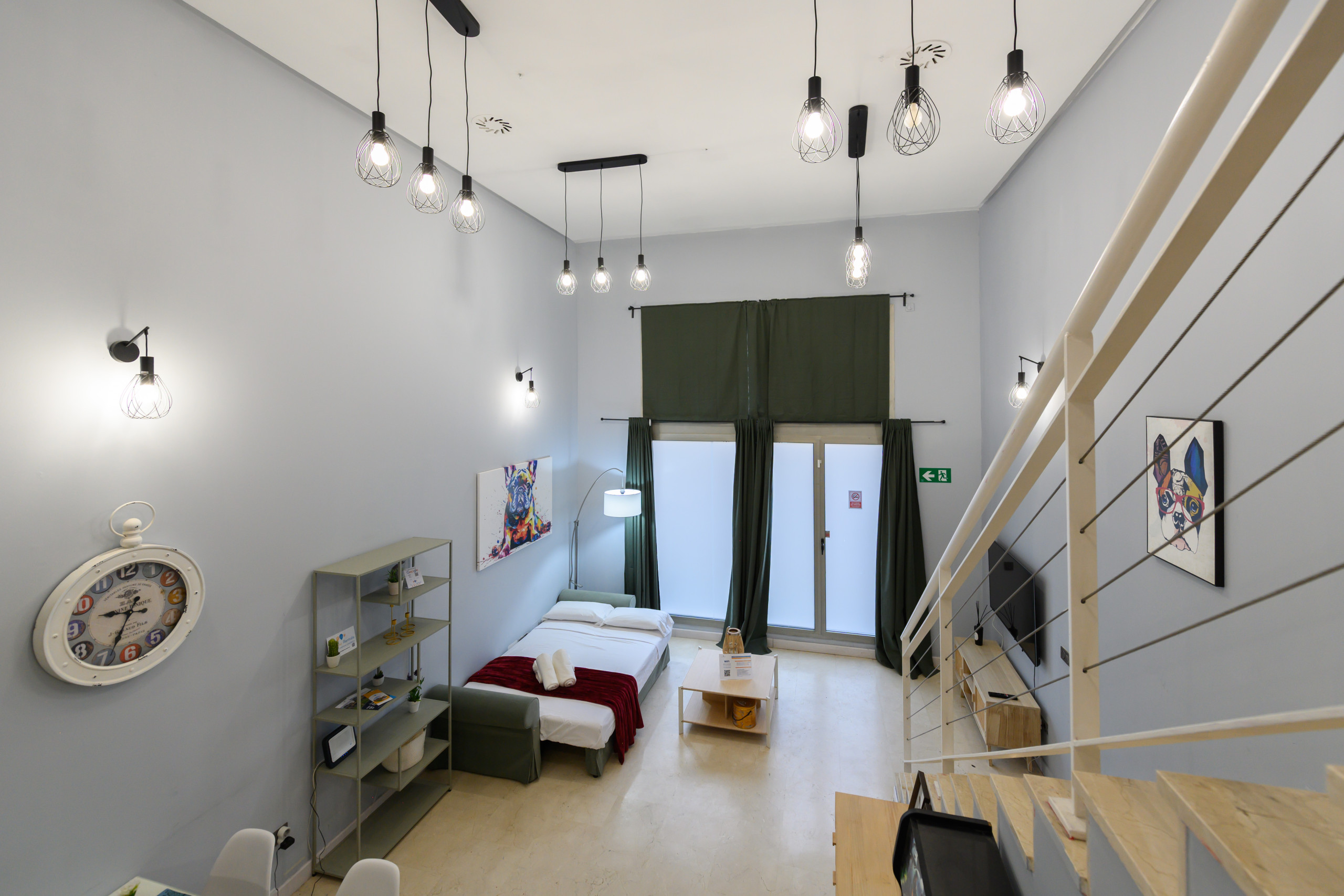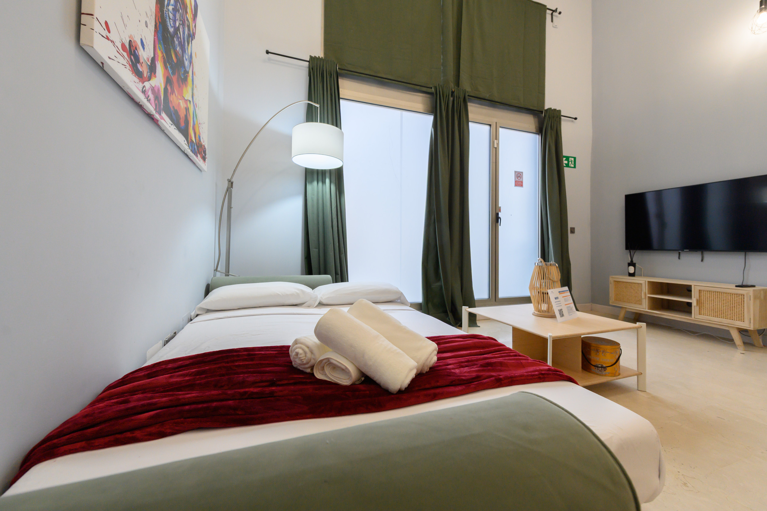 A bedroom with a double bed and a desk, perfect for those who need to work during their stay. The living room has a comfortable double sofa bed and is very bright.