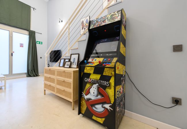 On the ground floor, there is a fully equipped open kitchen, with washing machine, fridge, microwave, and all the necessary utensils to enjoy a worry-free stay. The space connects to a comfortable living-dining room, ideal for relaxing after a day of activities. On this level, you will also find a courtesy toilet and an attractive play area equipped with an arcade machine, perfect for enjoying time with friends or family.