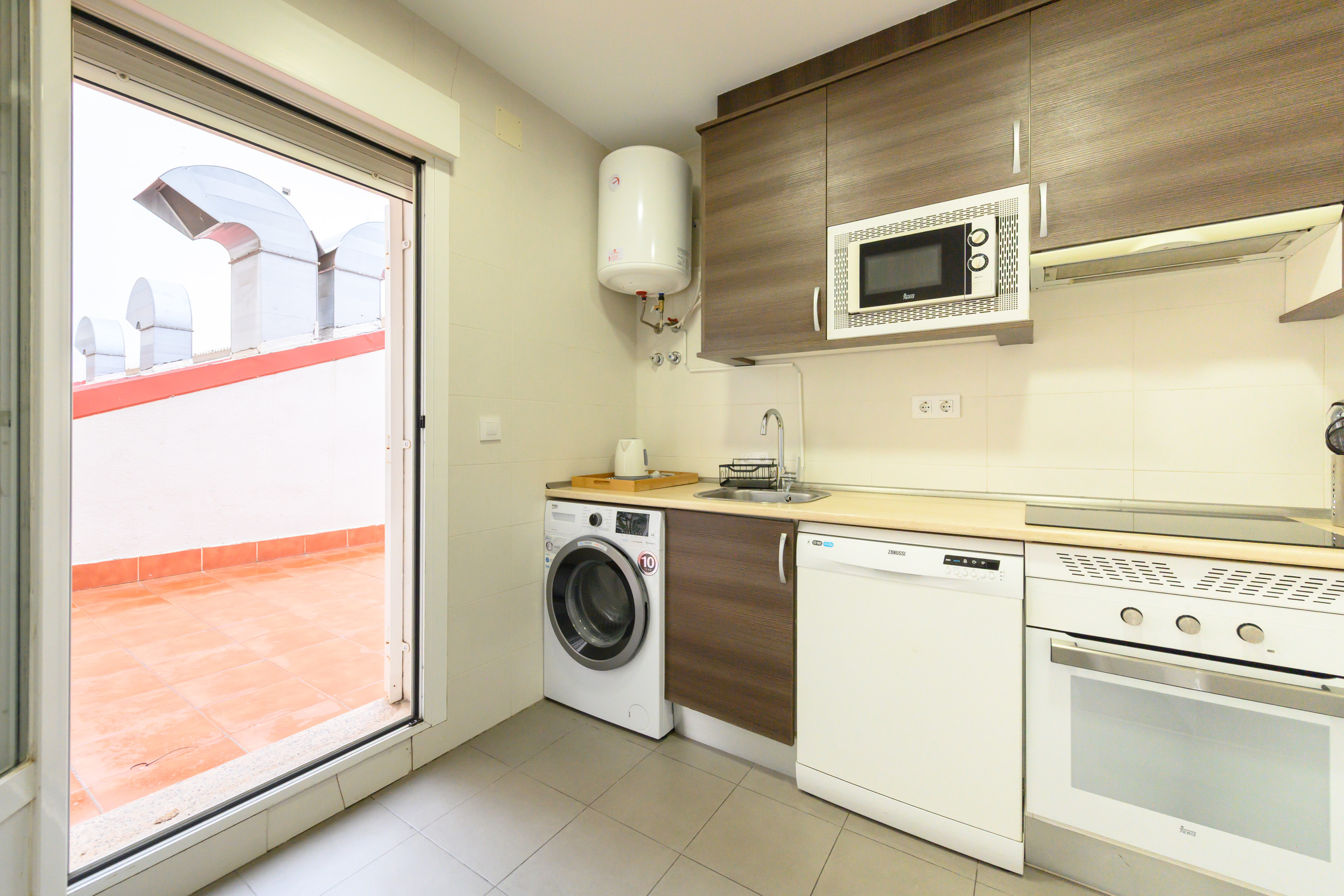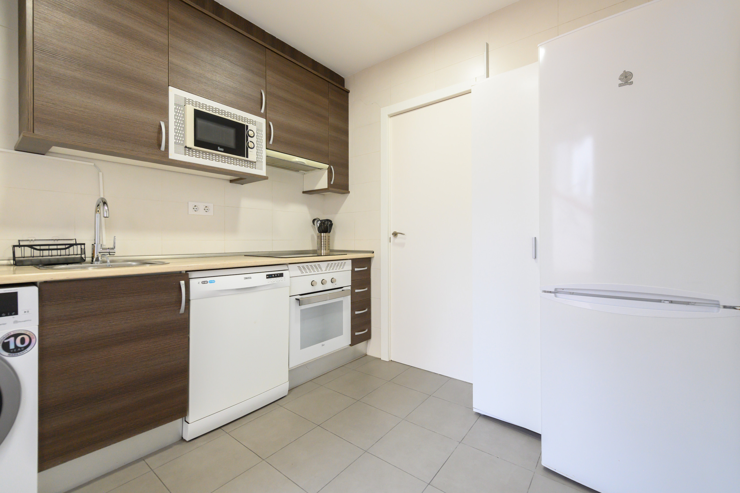The kitchen is fully furnished and equipped with modern appliances, including fridge, dishwasher, oven and microwave, designed for those who value comfort and practicality.
