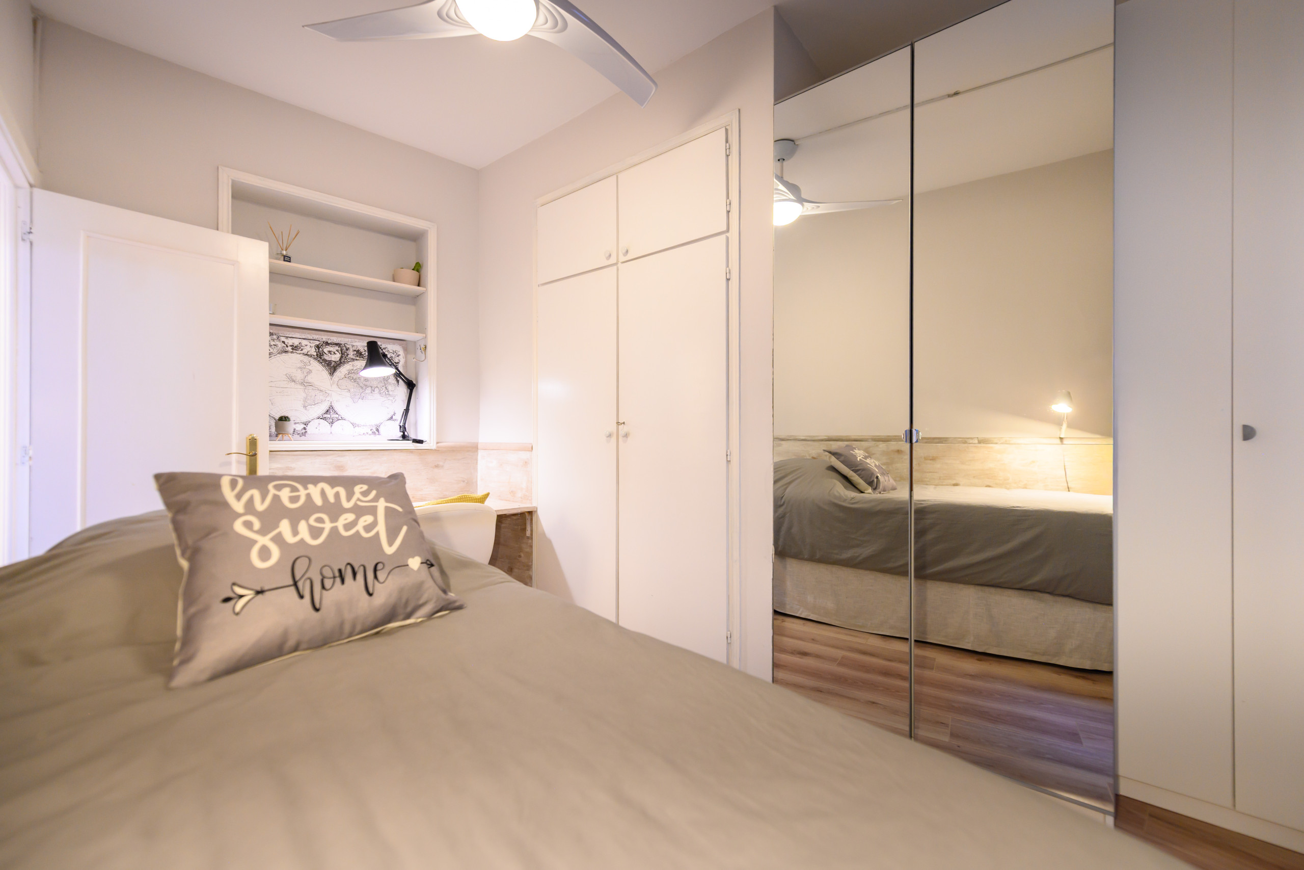 • Second bedroom with single bed, desk, mirror, and built-in wardrobe.