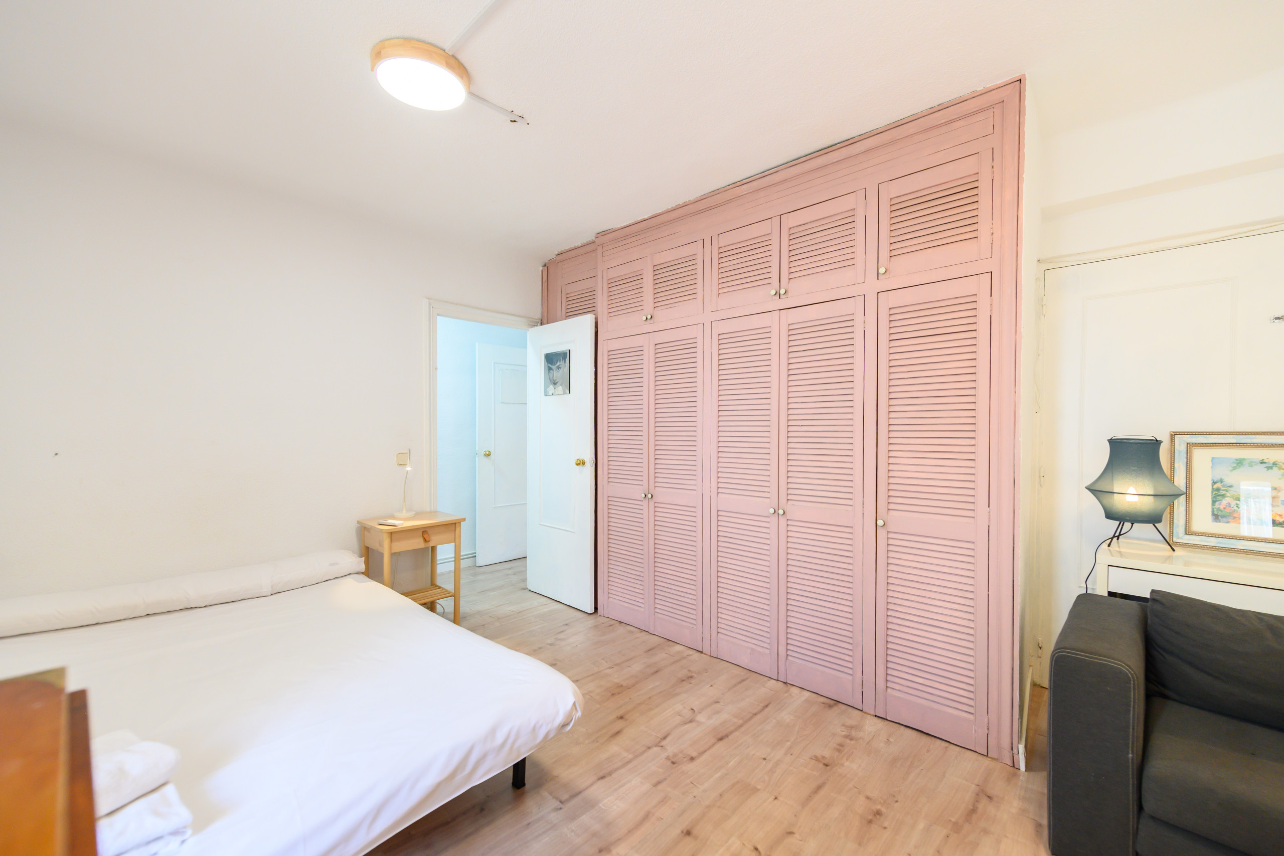 - Bedroom 2: furnished with a double bed and a single bed, sofa, dresser, nightstand, air conditioning, a large built-in wardrobe, and an additional storage area.