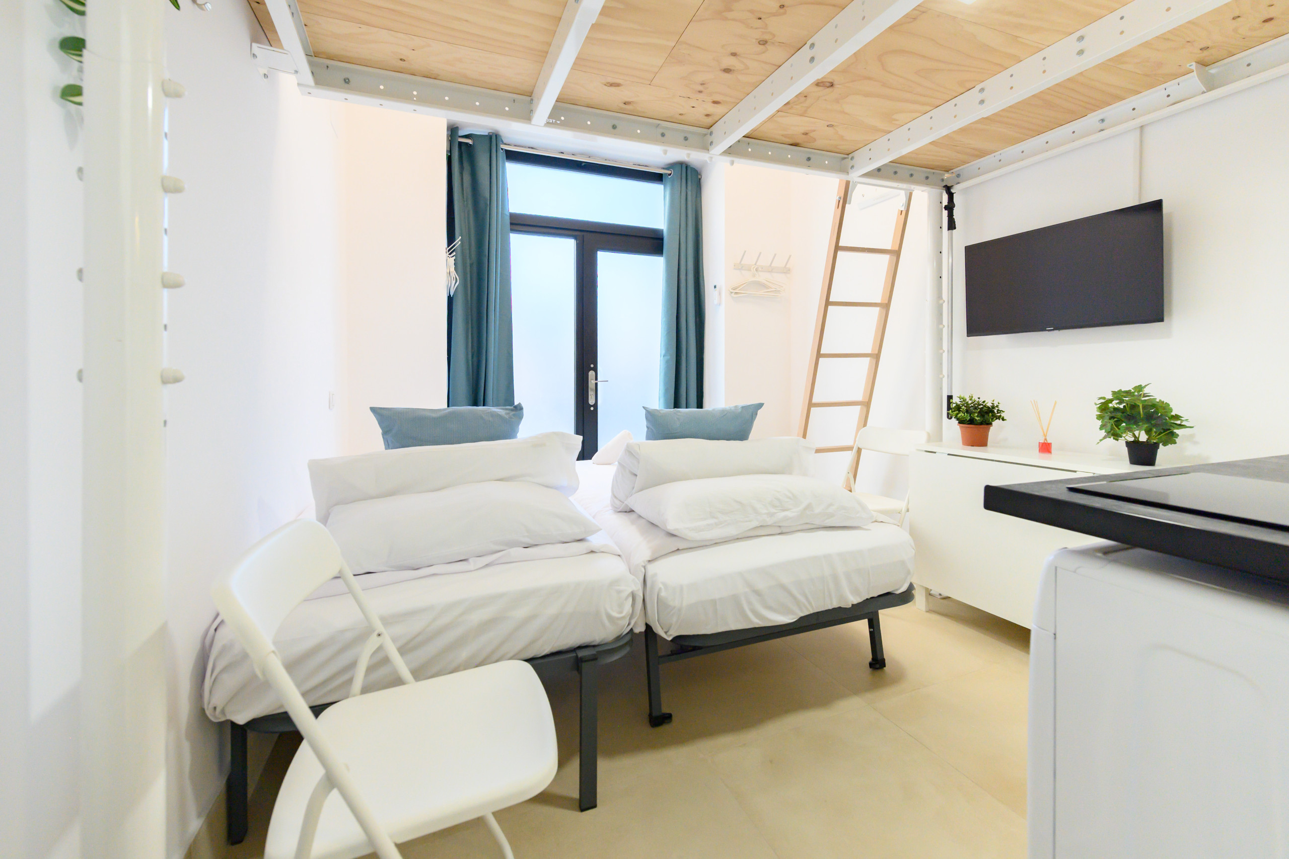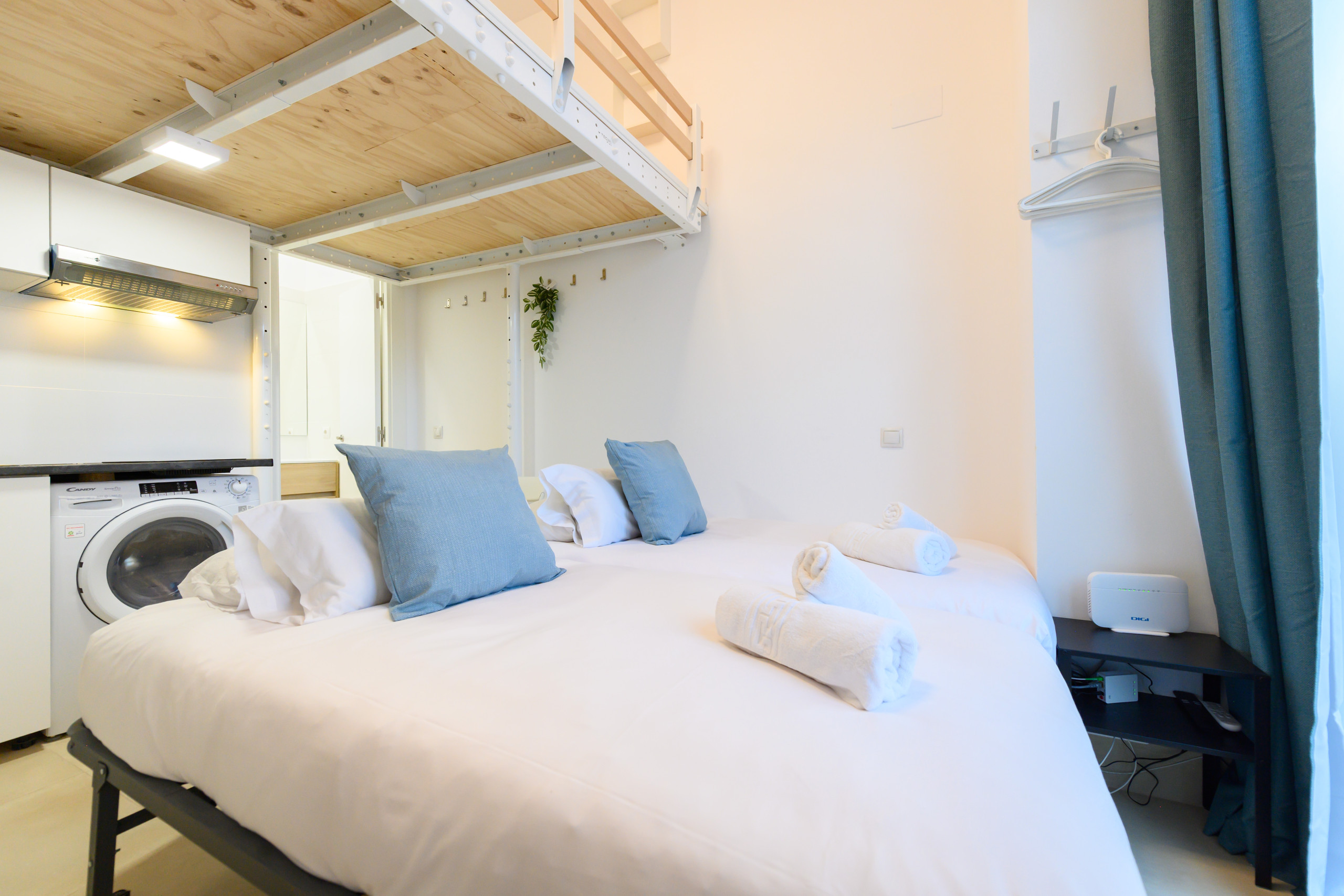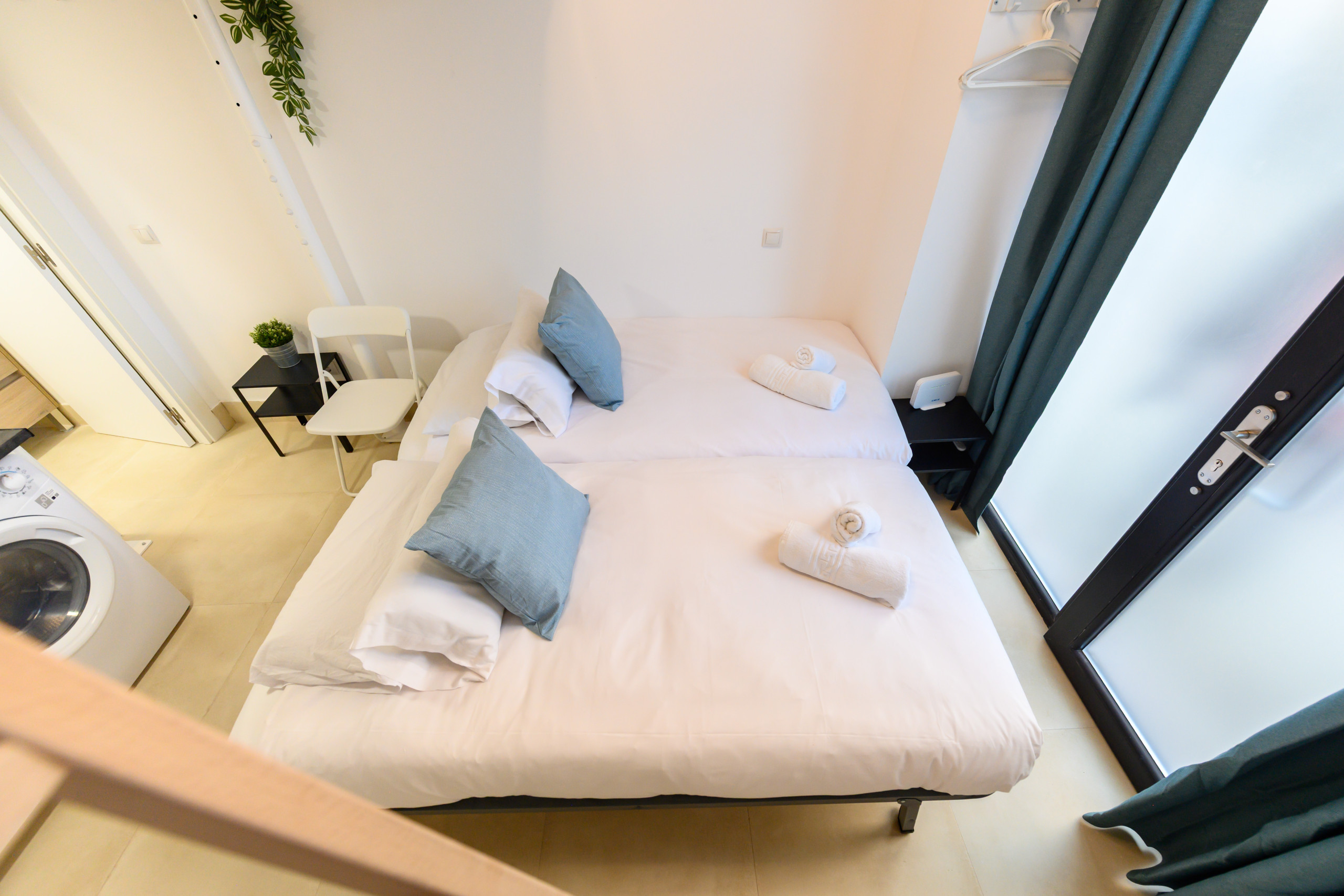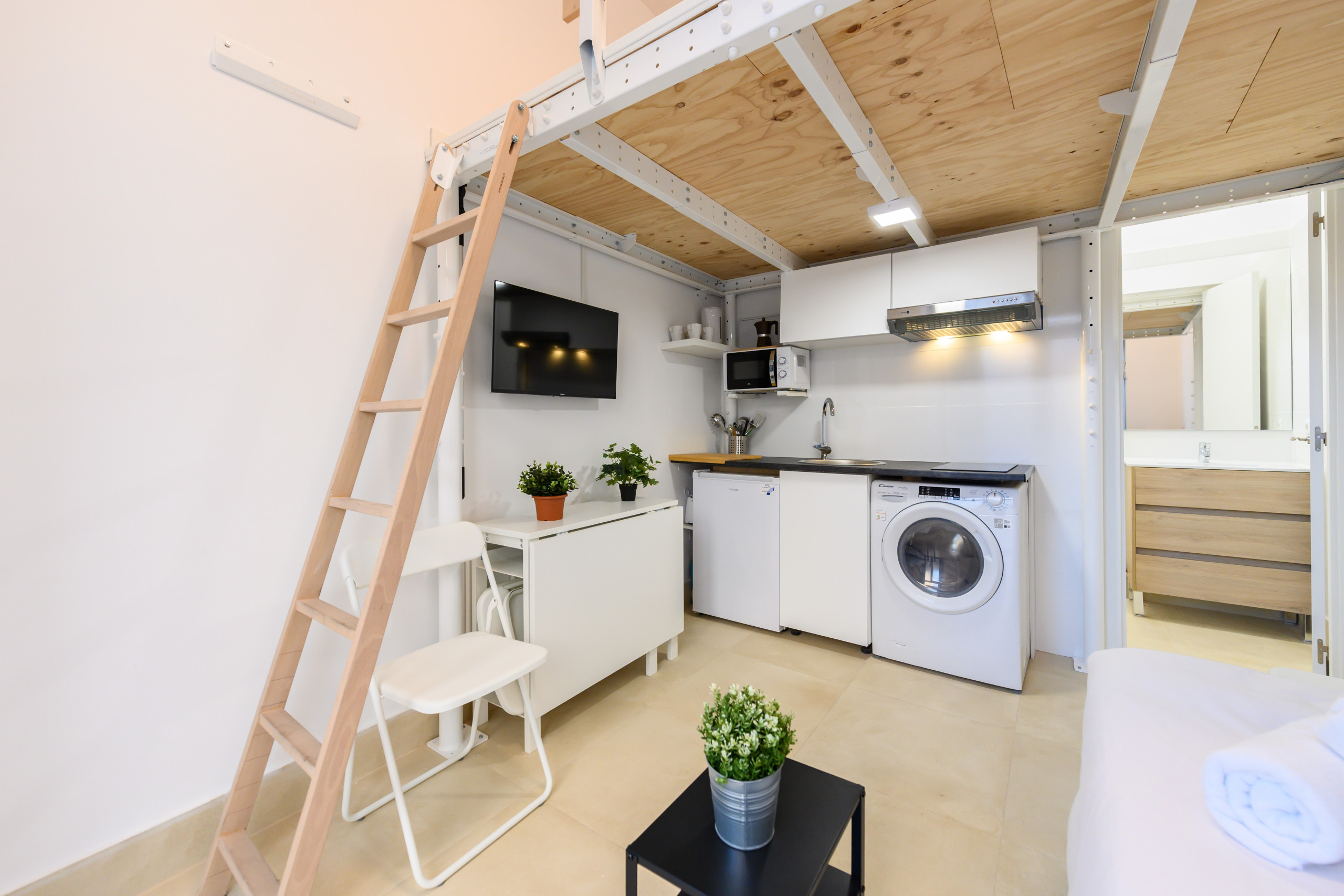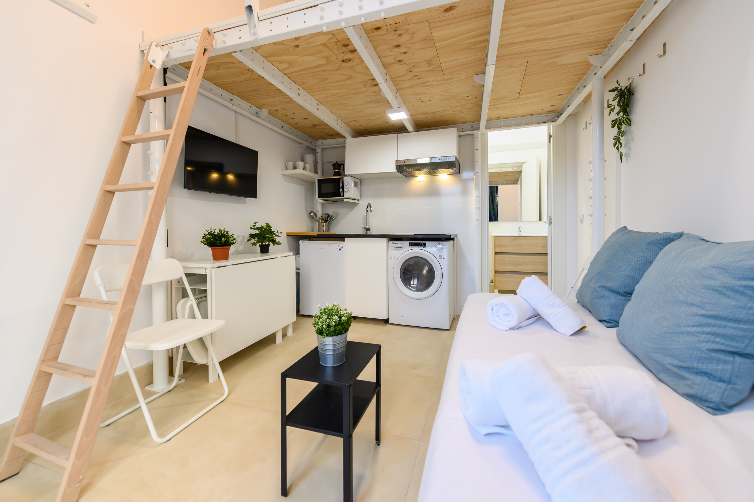 The apartment features: Upstairs: double bed. Downstairs: two single beds, table, chairs, TV, and air conditioning. Full bathroom with toilet, shower, mirror, and space for toiletries. Kitchen equipped with microwave, refrigerator, washing machine, and kitchenware.