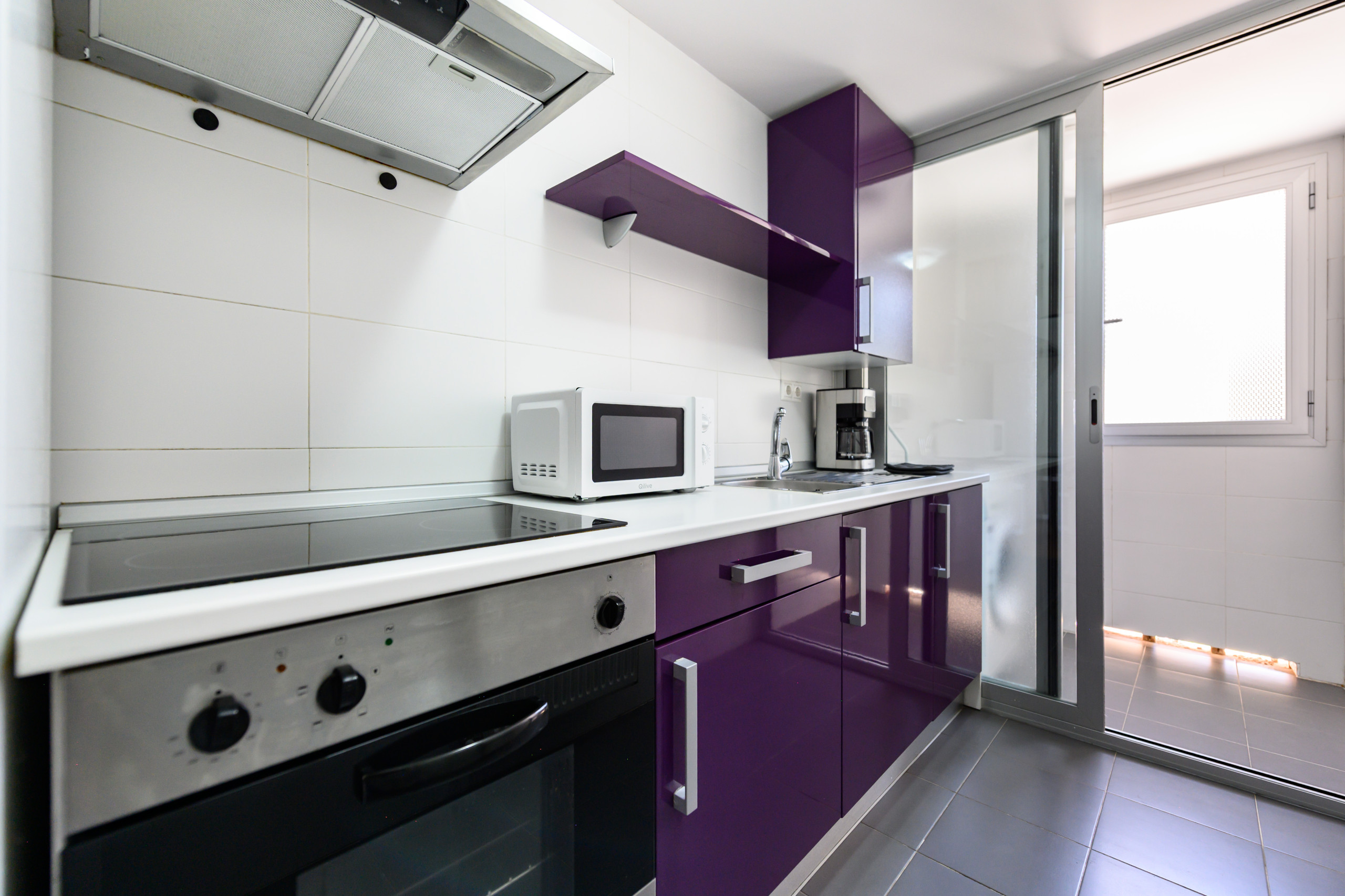 • A fully equipped kitchen with a microwave, refrigerator, oven, coffee maker, washing machine, and storage space.