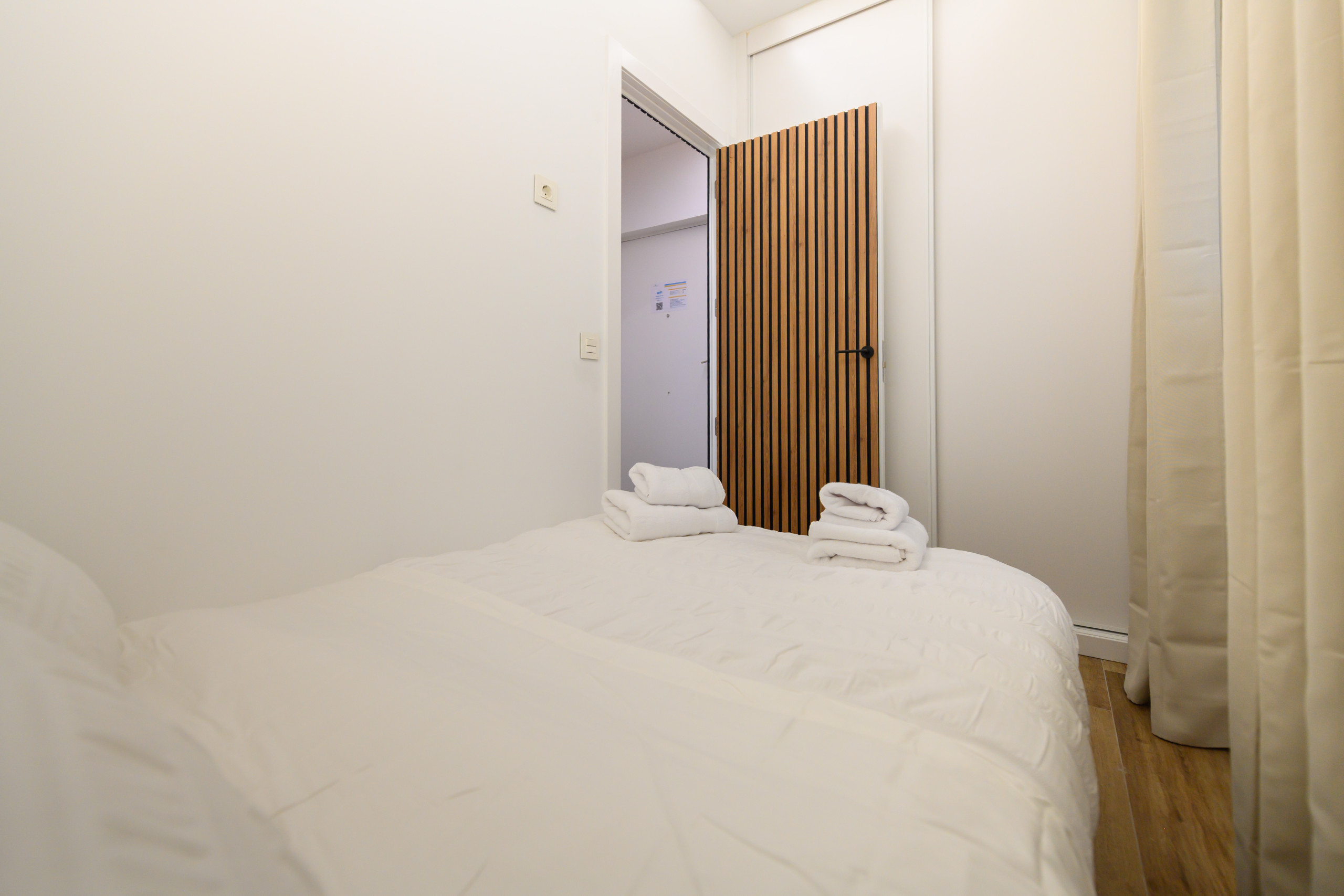 A bedroom with a double bed and a desk, perfect for those who need to work during their stay. The living room has a comfortable double sofa bed and is very bright.