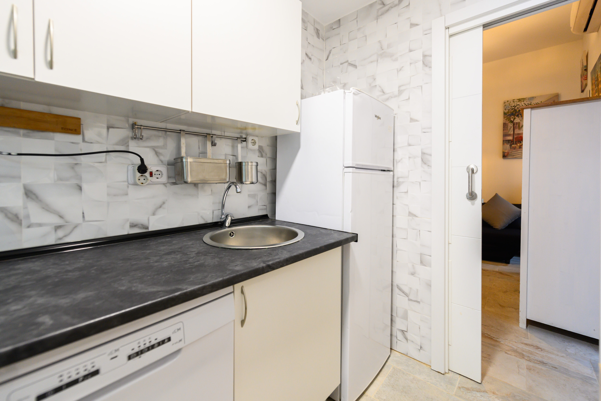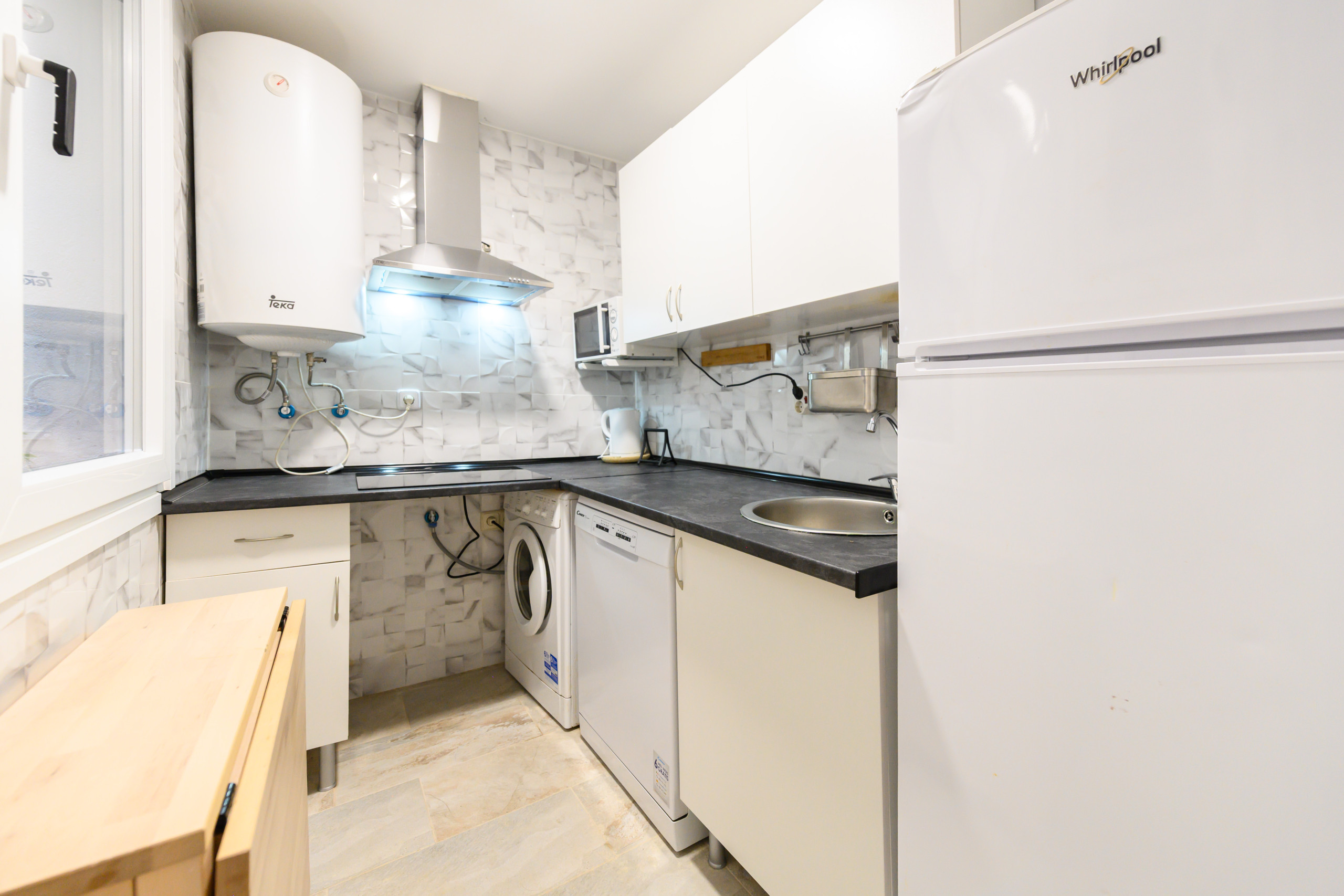 • Equipped kitchen: refrigerator, microwave, washing machine, dishwasher, table, and kitchen utensils.