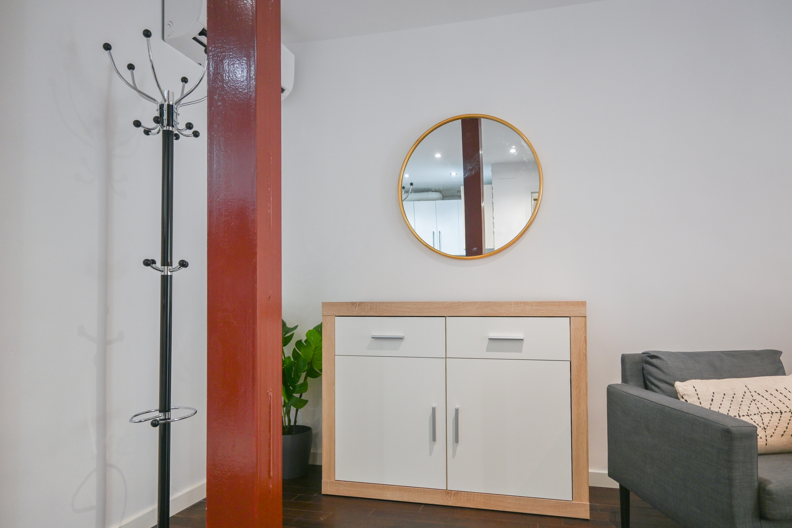 This bright and welcoming apartment has two spacious bedrooms, each equipped with a double bed and desk, perfect for resting or working comfortably. The living room is spacious and contemporary in style. The sofa bed blends perfectly into the space, offering a comfortable and practical solution when additional sleeping space is needed; it includes a balcony overlooking the vibrant Calle Santa Engracia, allowing natural light to flood the space thanks to its exterior orientation. In addition, the apartment has a comfortable dining room, ideal for enjoying your meals.