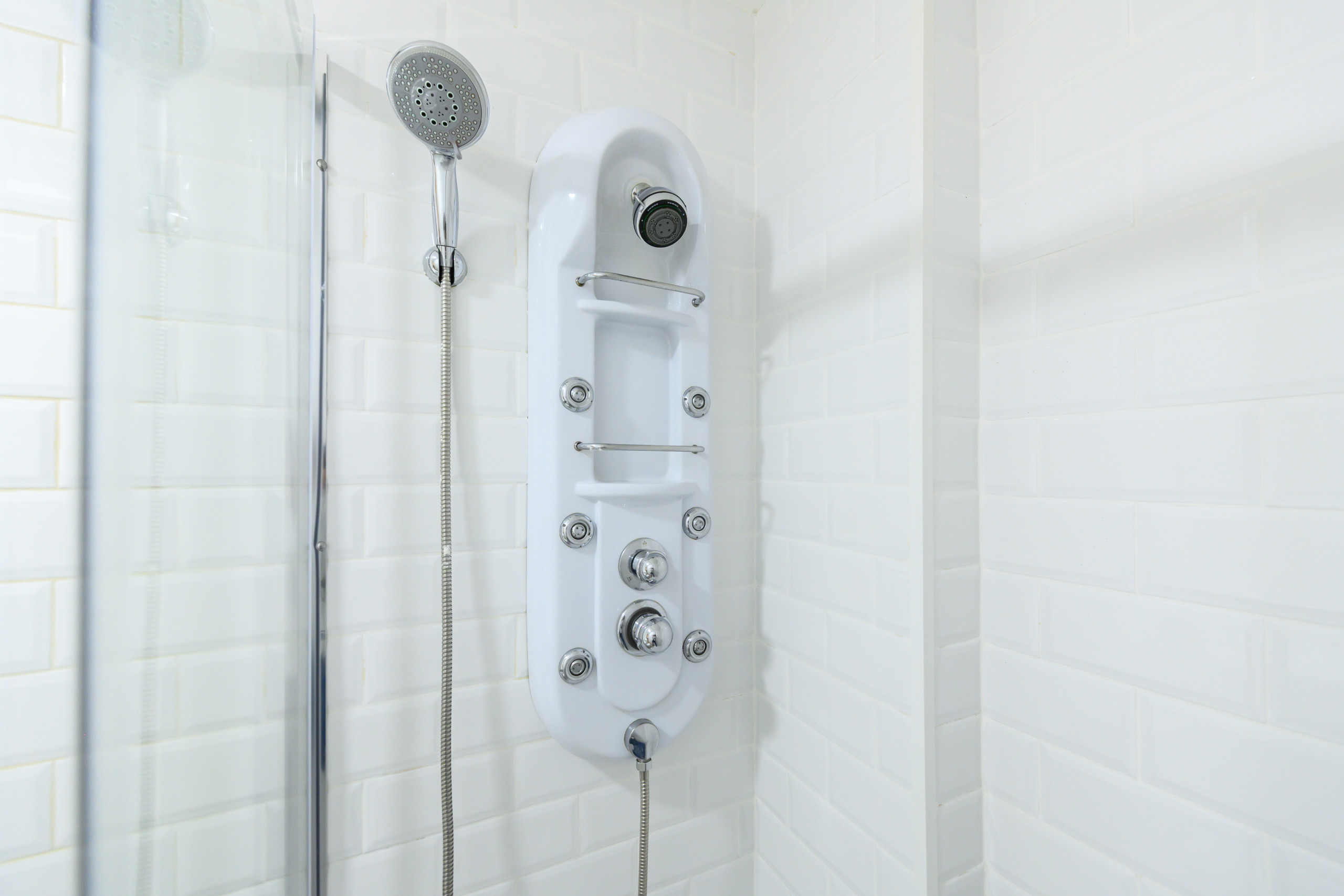 • Full bathroom with shower, toilet, mirror, washing machine, and storage space.