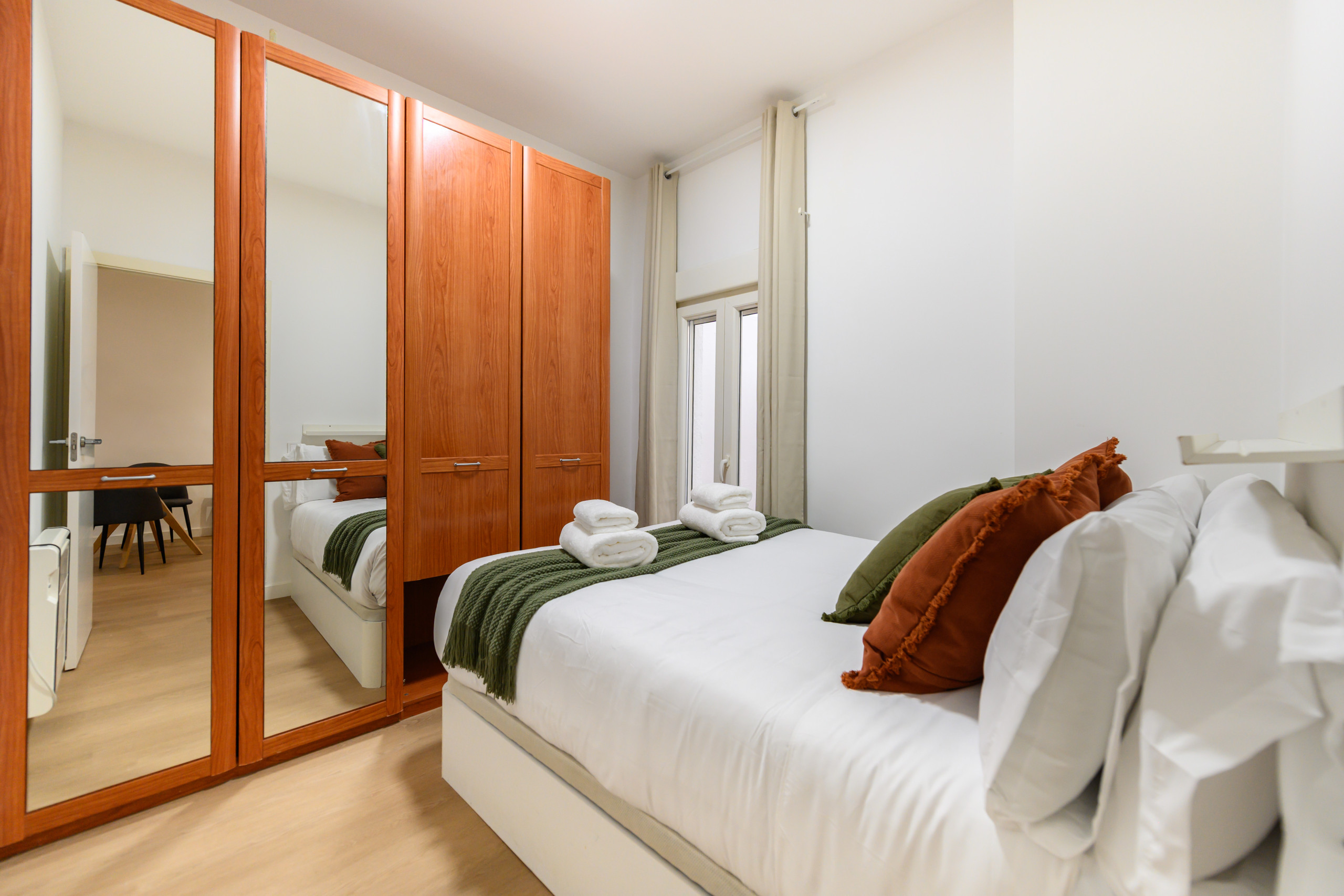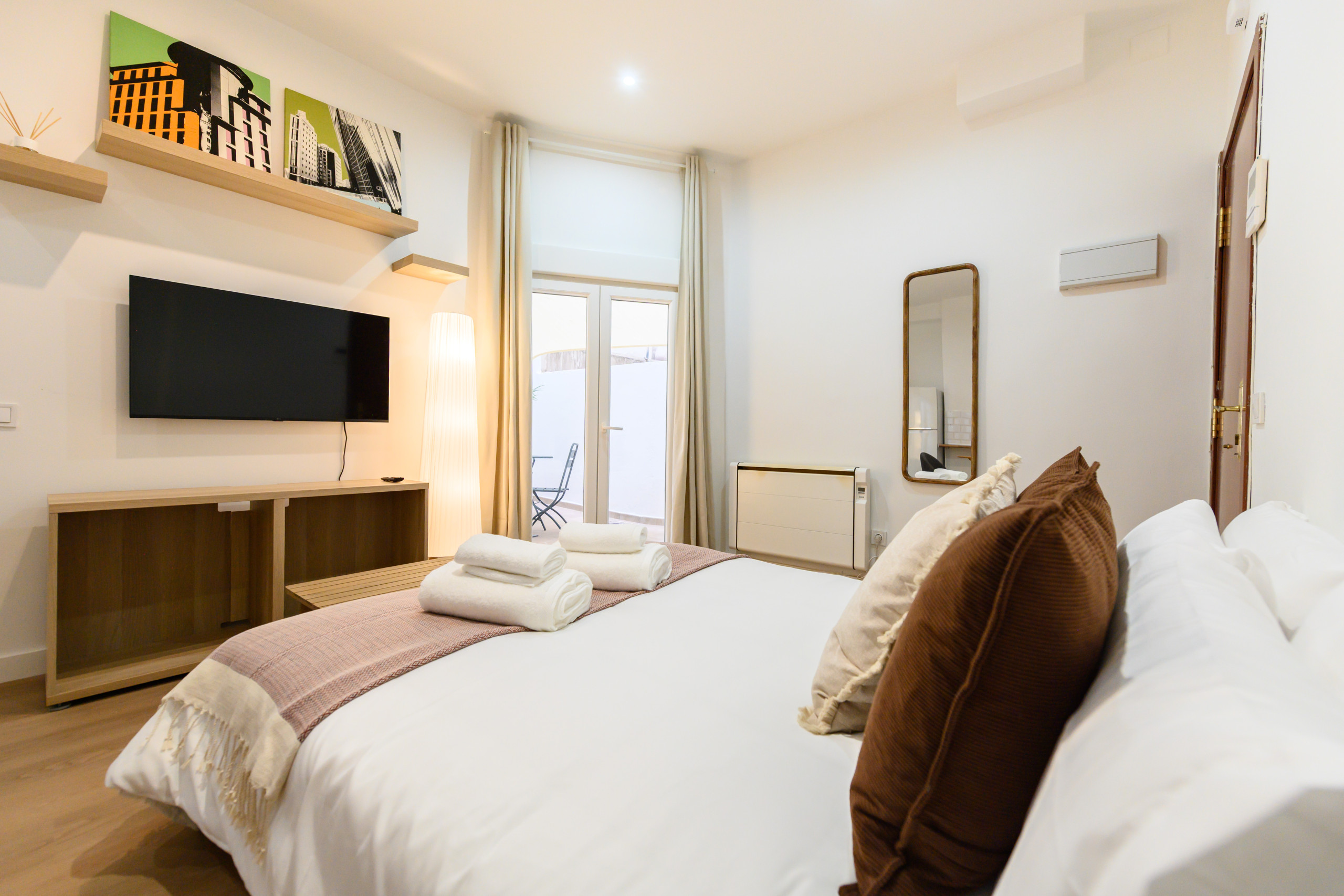 • Bedroom with a double bed and storage underneath, a large wardrobe with a mirror, and direct access to the terrace.