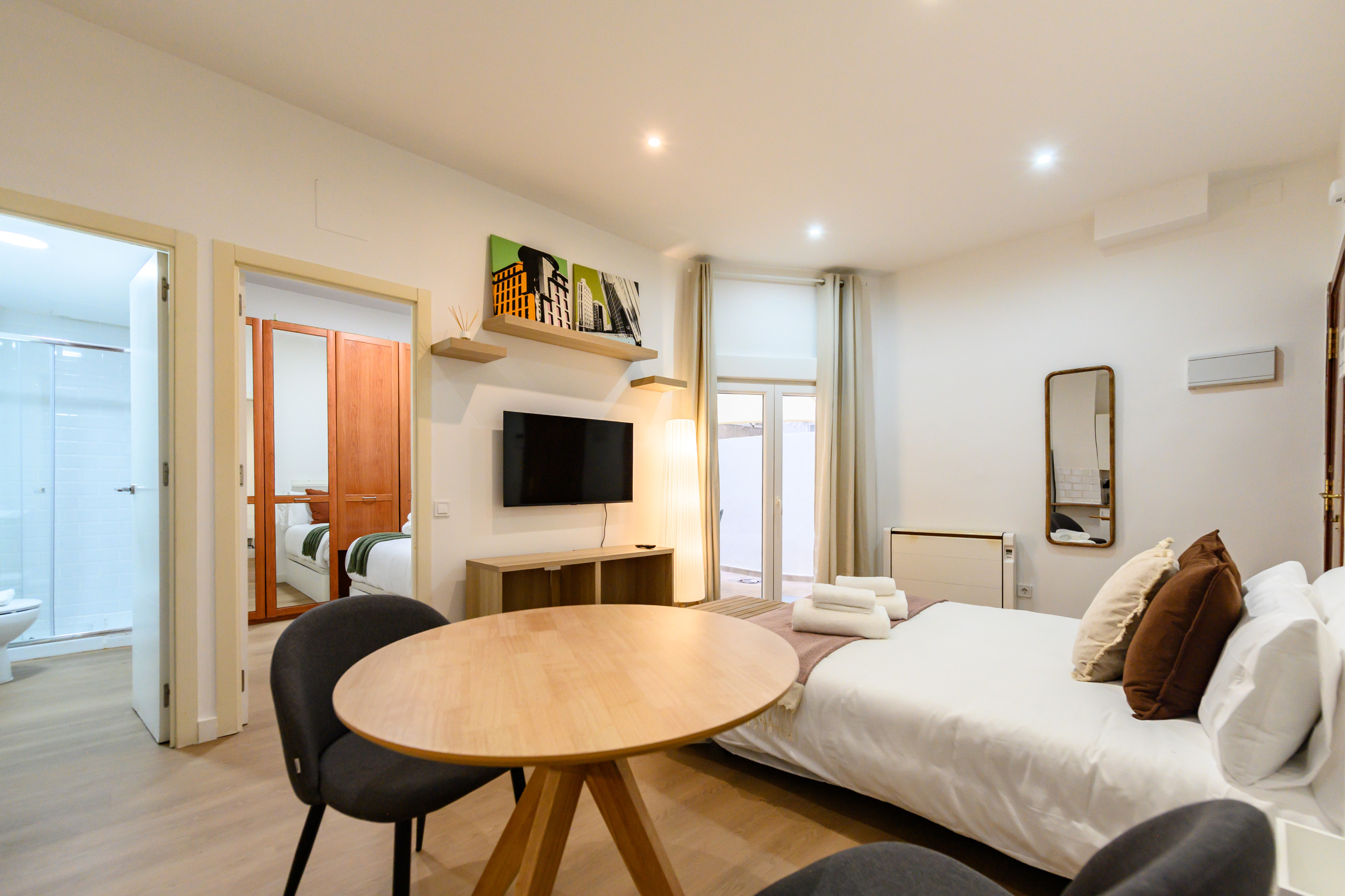 • Living room convertible into a double sofa bed, TV, and dining table.