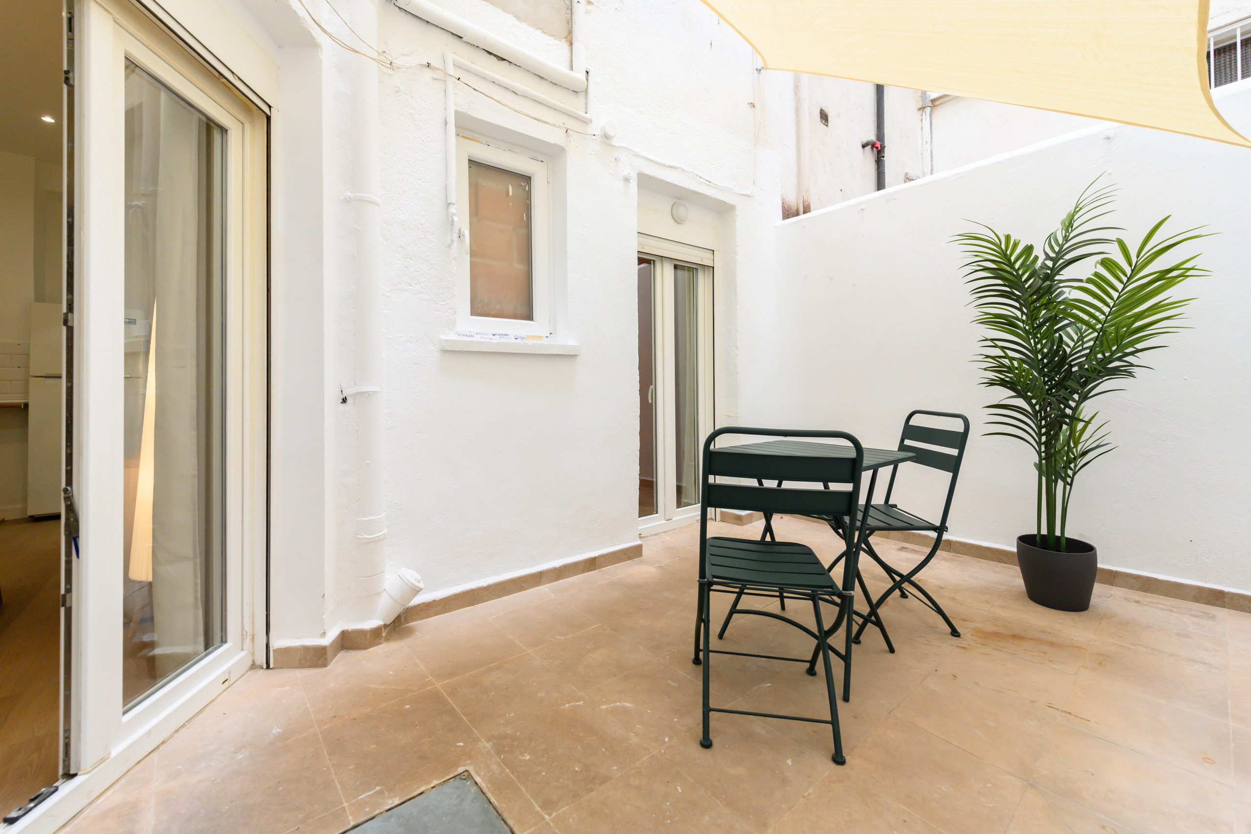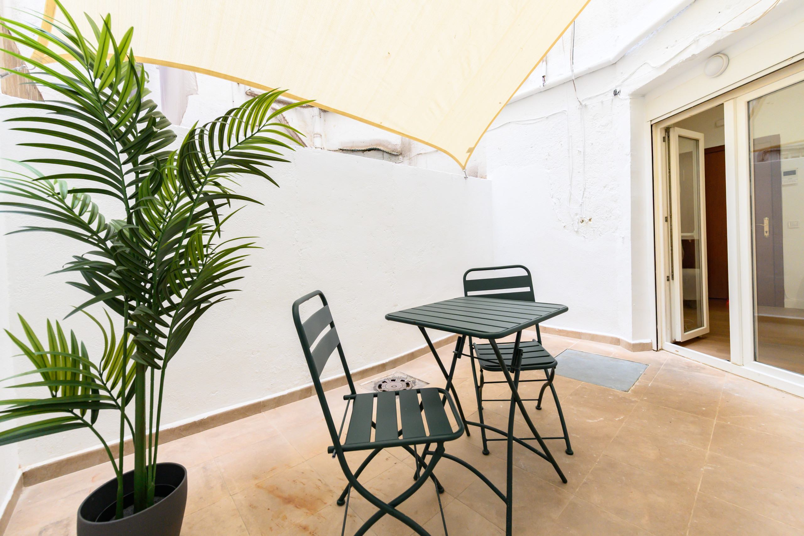 • Large terrace furnished with a table and chairs.