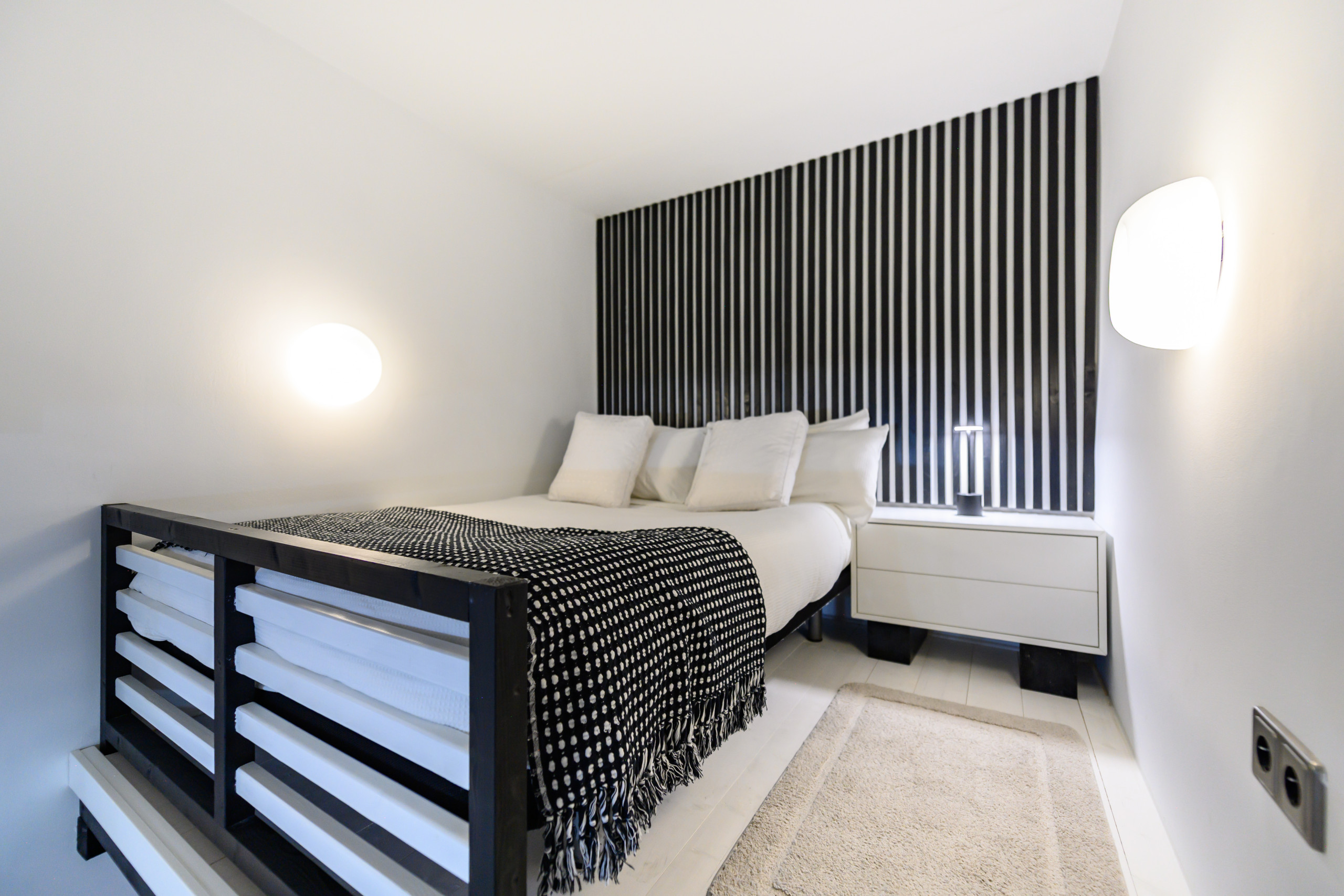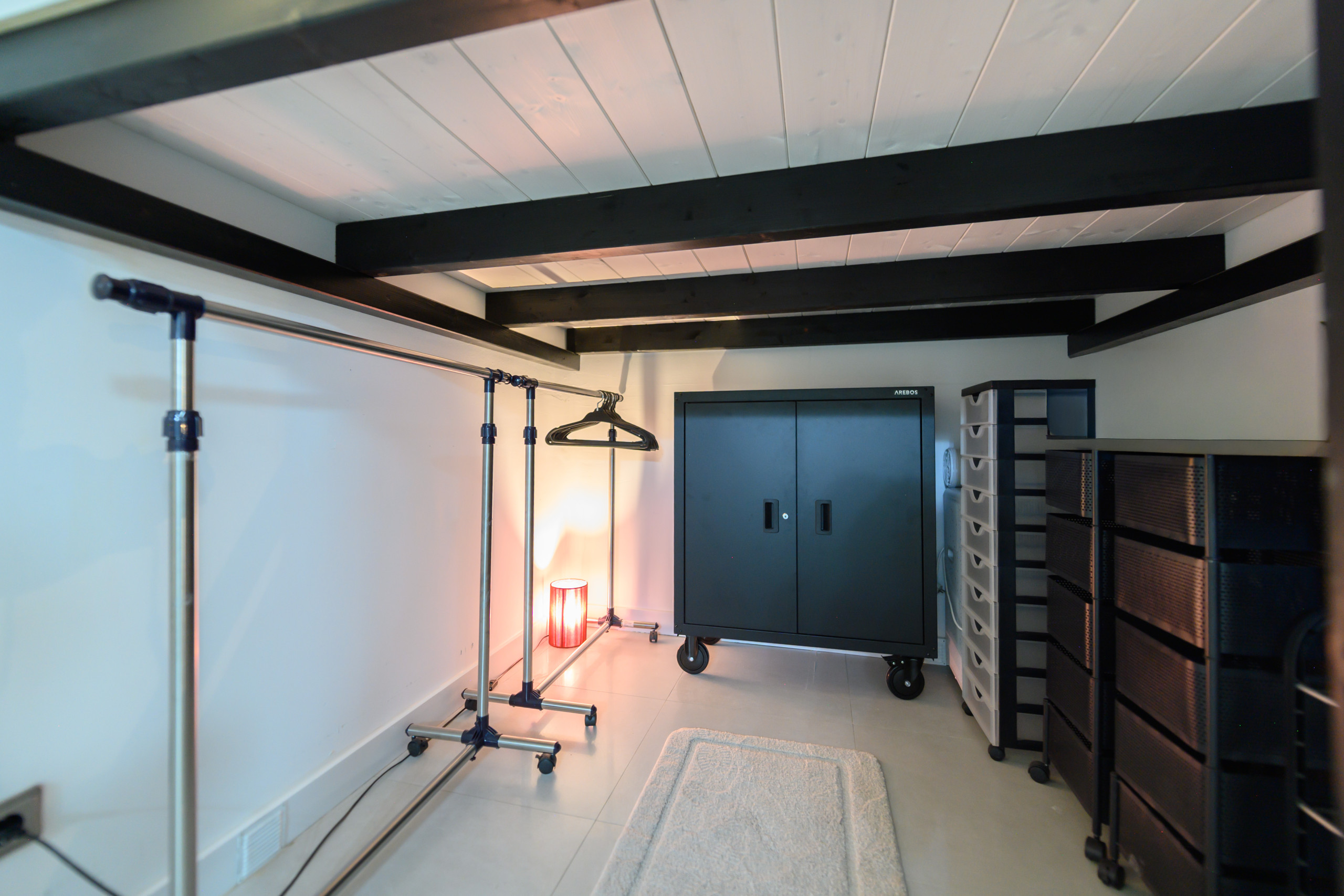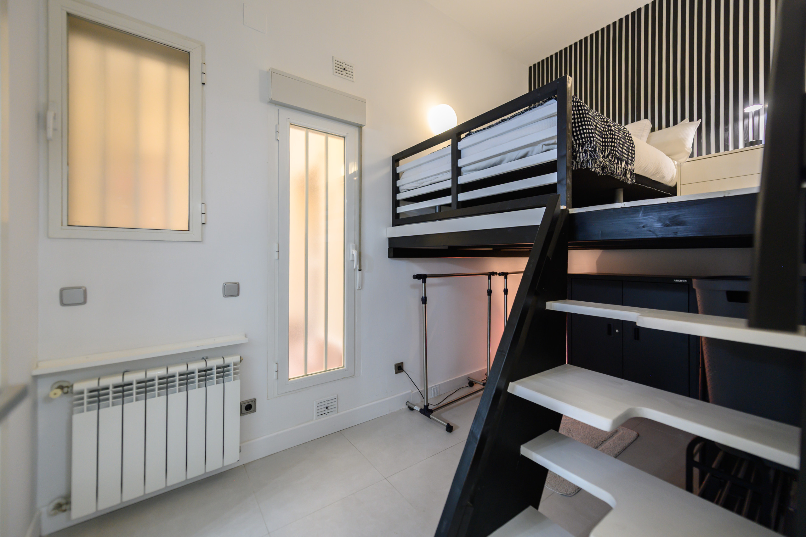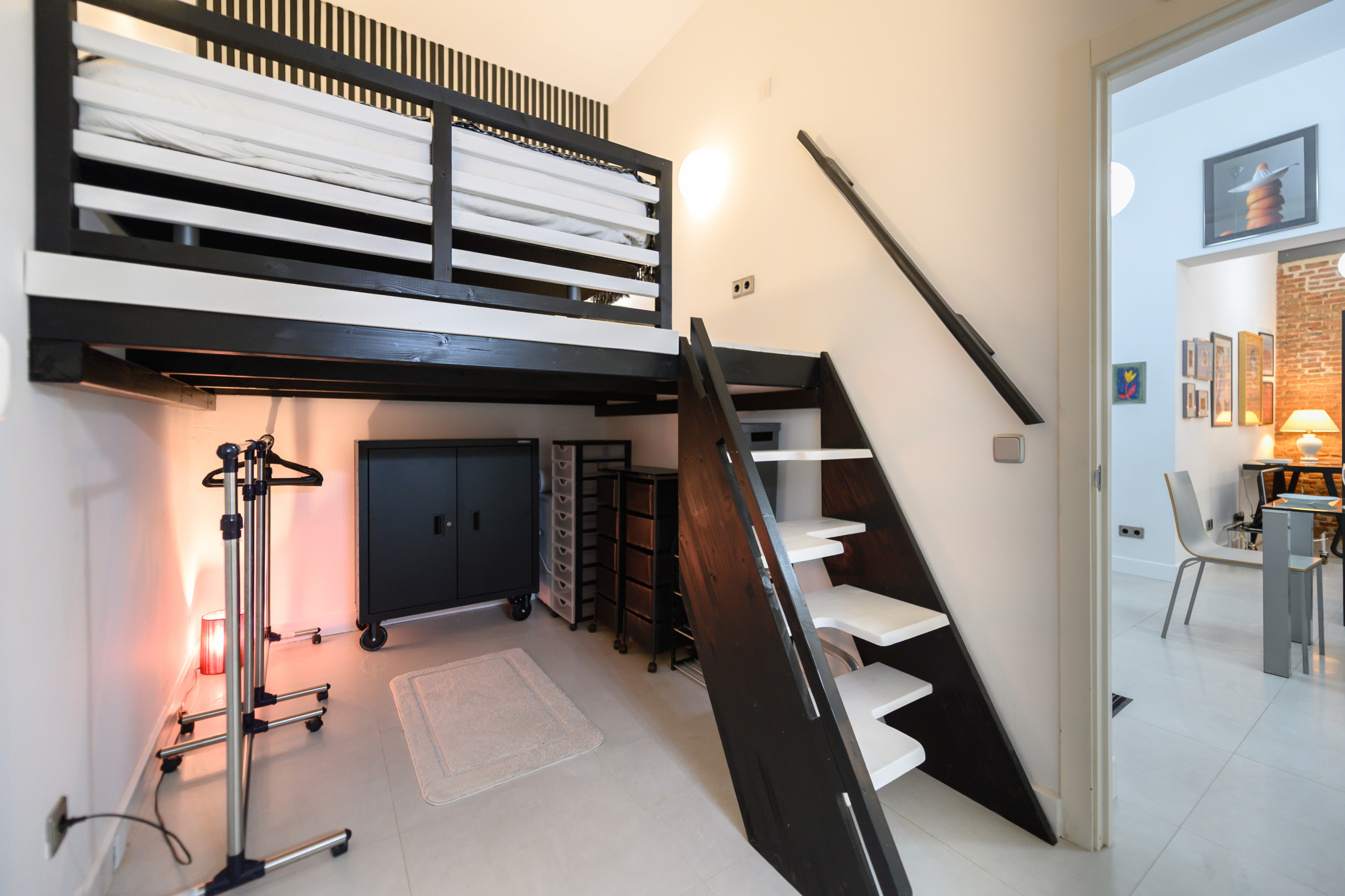 - Bedroom with a double bed, nightstand, clothes rack, and ample storage space.