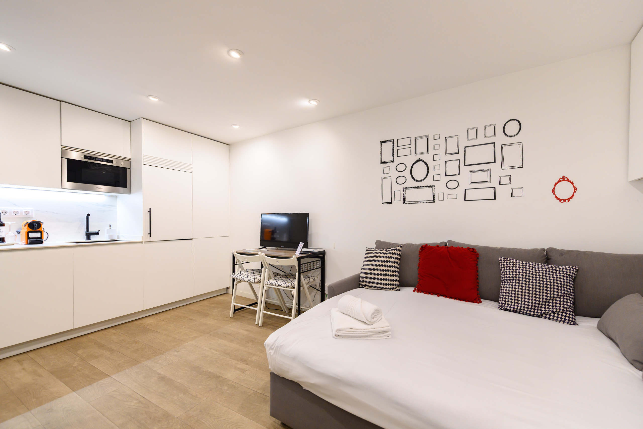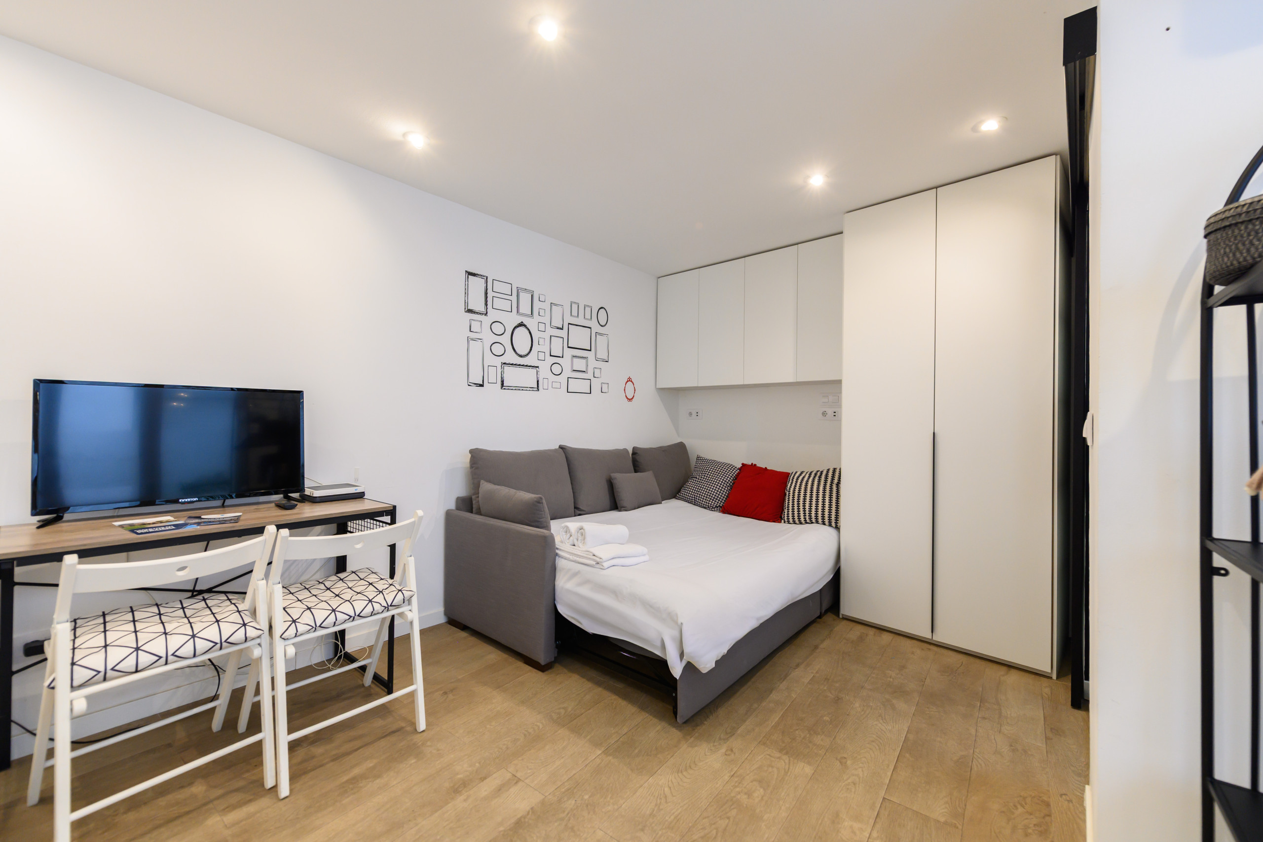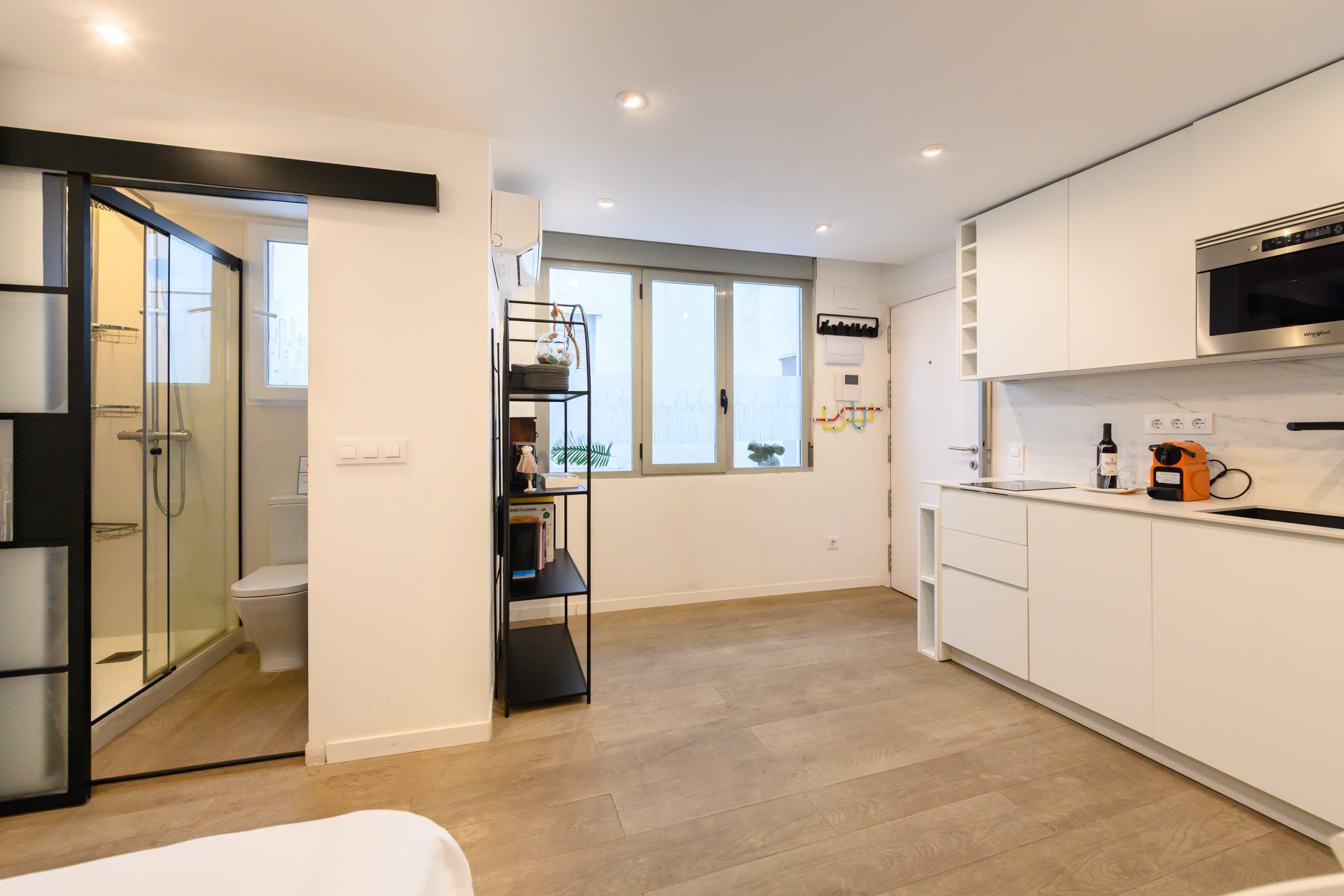 The apartment in Madrid has capacity for 2 people. The apartment is 25 m². The accommodation is equipped with the following items: lift, washing machine, iron, internet (Wi-Fi), hair dryer, heat pump, air-conditioned, open-air parking near the building, 1 TV, satellite tv (Languages: Spanish, English, German, Dutch, French, Russian, Swedish, Norwegian).In the induction open plan kitchen, refrigerator, microwave, freezer, dishes/cutlery, kitchen utensils, coffee machine, toaster, kettle and juicer are provided.