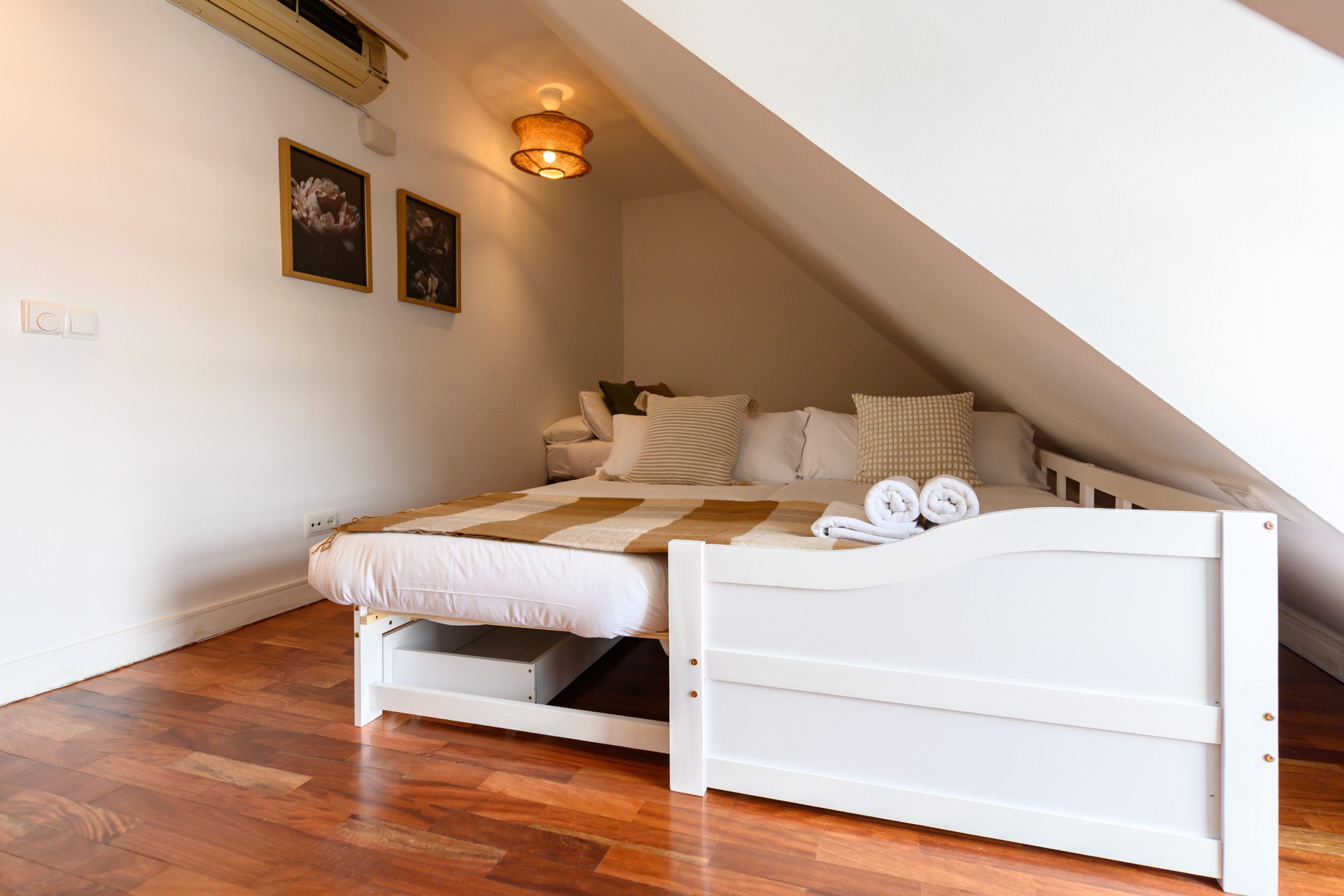 The flat has two bedrooms, one with a double bed and another with a trundle bed, perfect for children or guests. Both bedrooms are designed to offer restful sleep, with high-quality mattresses and soft, comfortable bedding.
