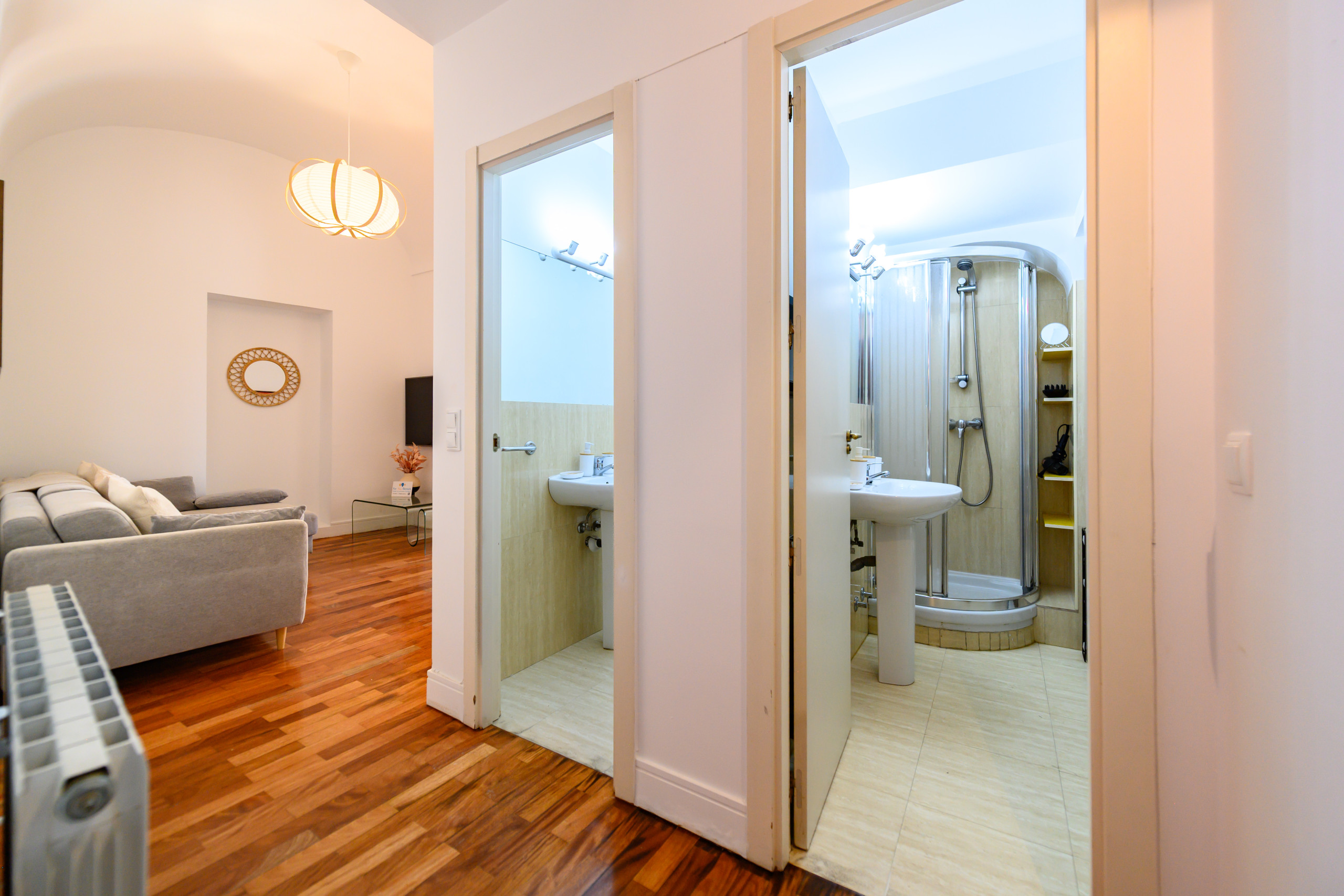 The bathroom, modern and functional, has a shower tray. The layout of the bathroom ensures easy access from any part of the apartment, making your stay even more comfortable and relaxing.