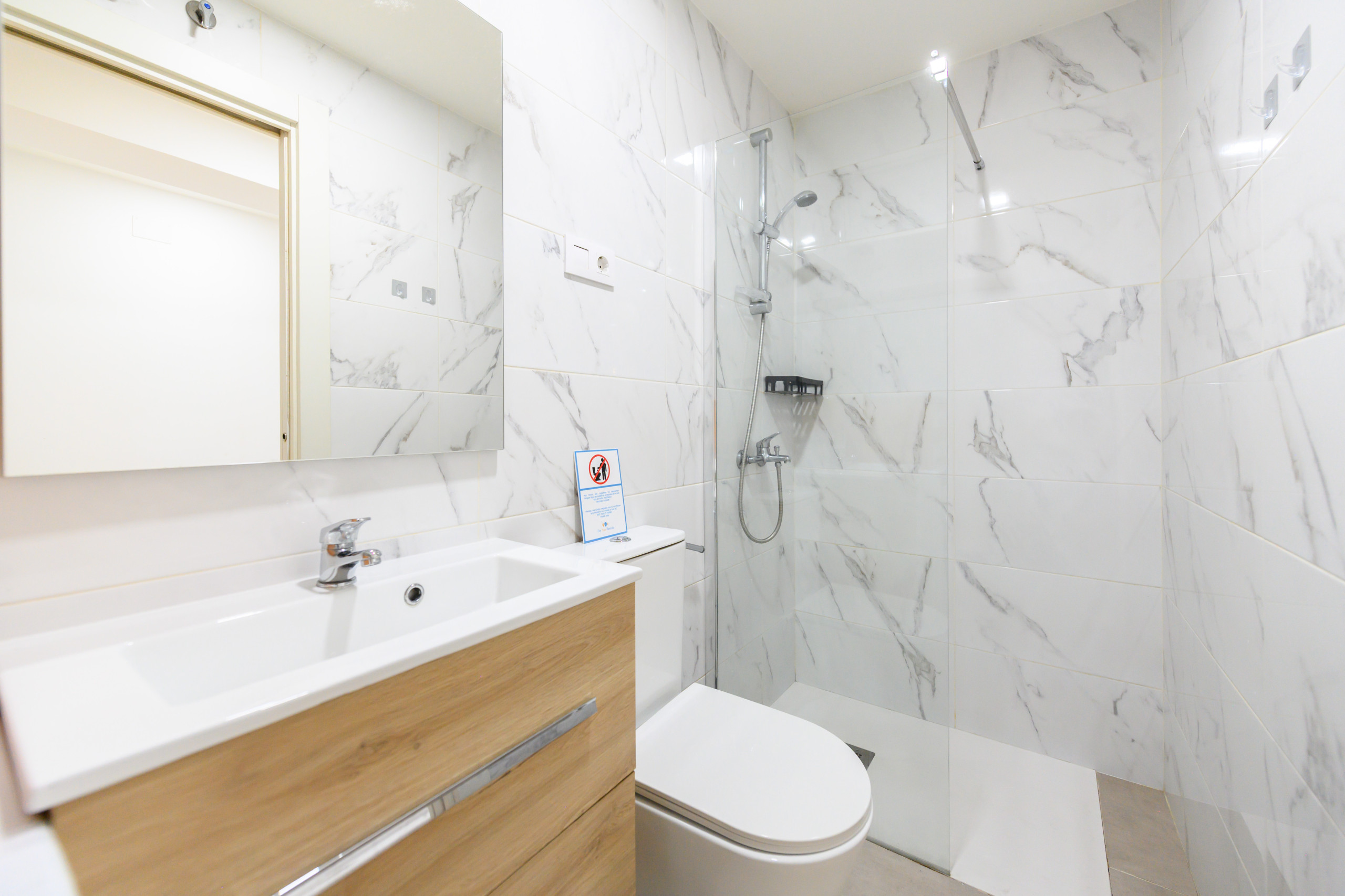 • Living area: double bed, wardrobe, clothes rack, chest of drawers, sofa that converts into a double sofa bed, air conditioning, heating, dining table, TV, and extra storage space. Fully equipped kitchen: refrigerator, microwave, dishwasher, storage space, and kitchen utensils. Full bathroom: toilet, shower, mirror, storage space, and washing machine.