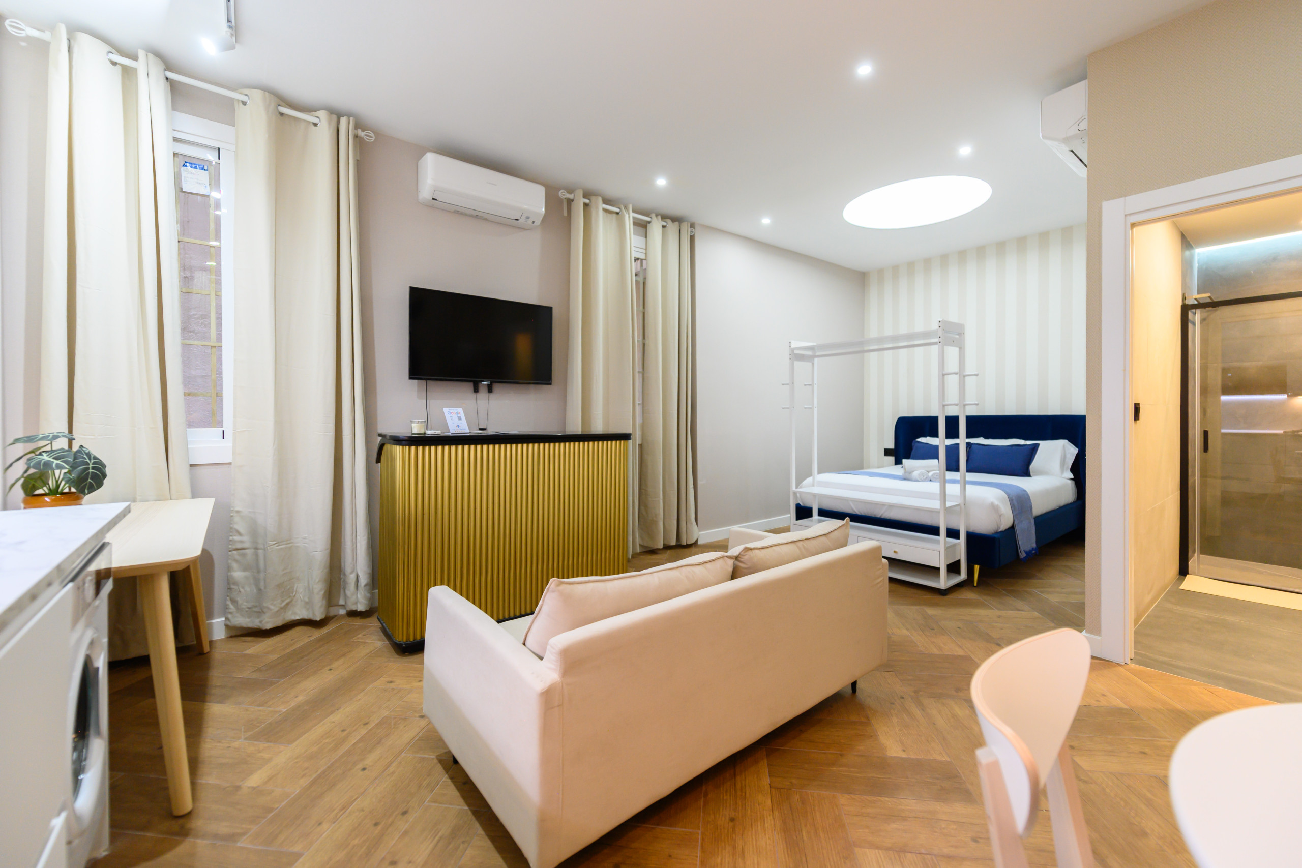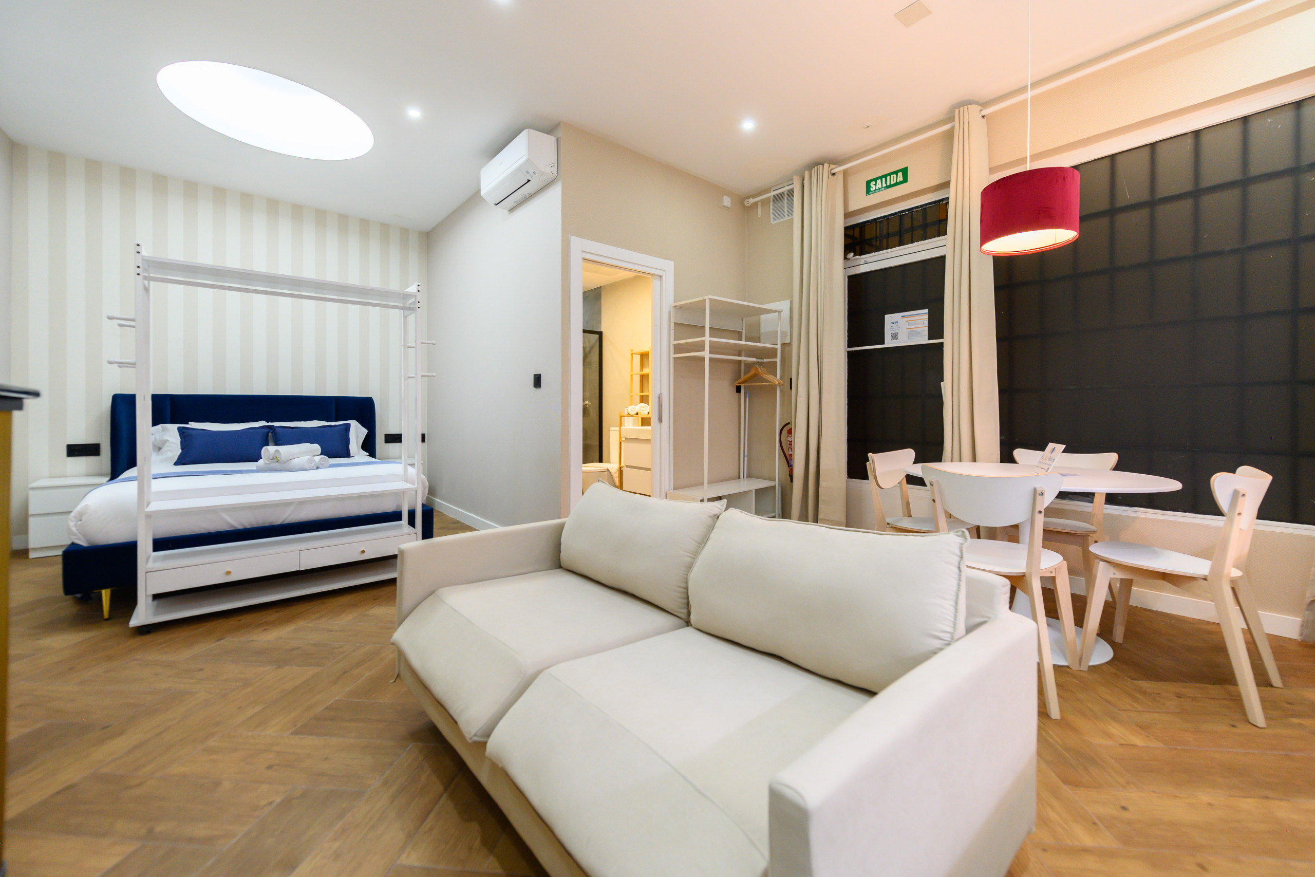 Upon entering, you'll find yourself in the main space of the studio. Here, you'll discover a sofa bed that is a versatile central piece. During the day, it's a cosy reading corner or a place to relax while planning your Madrid adventures. At night, it transforms into a comfortable bed for restorative rest.
