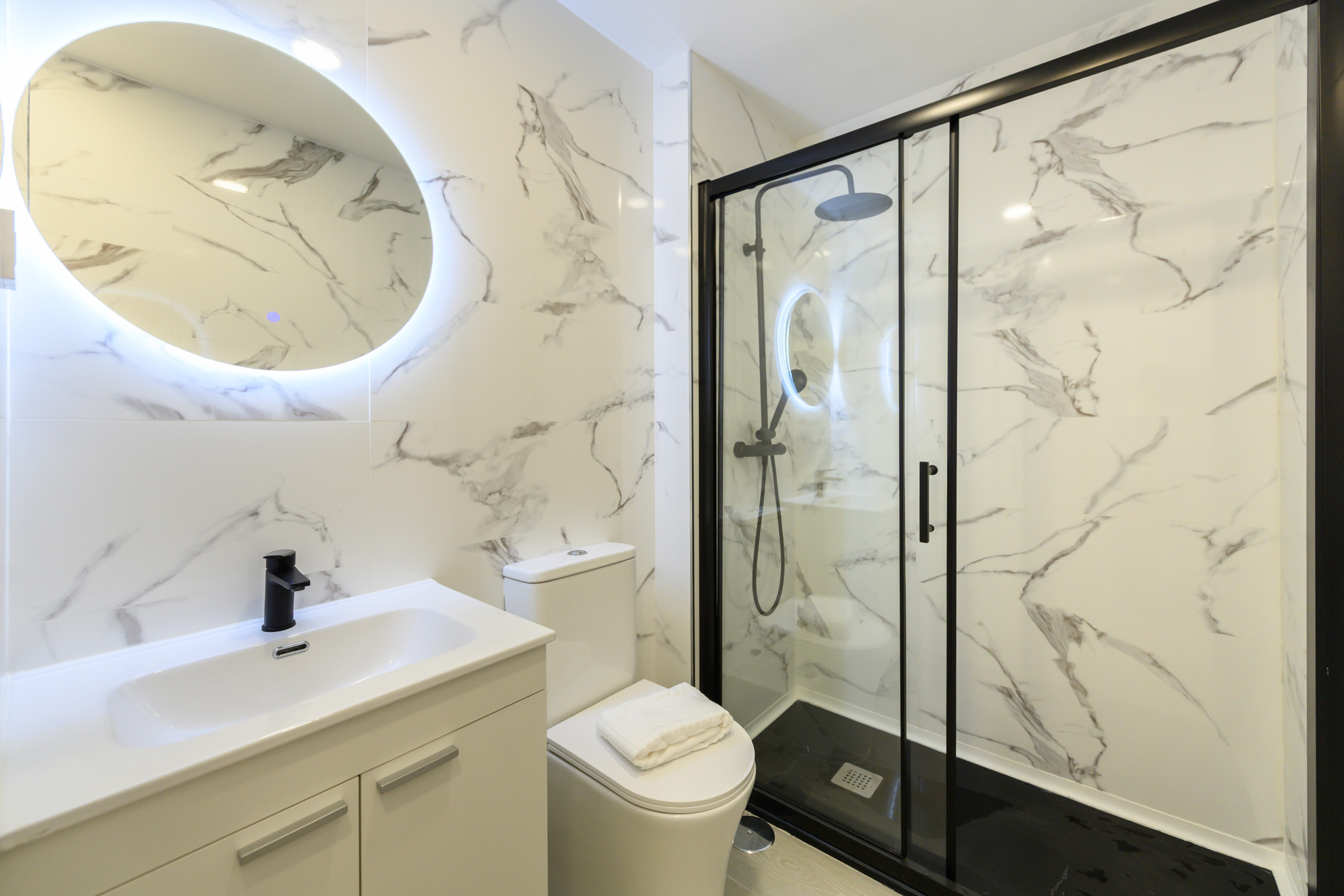 • Deuxième salle de bain complète avec WC, douche, miroir et espace pour les articles de toilette.