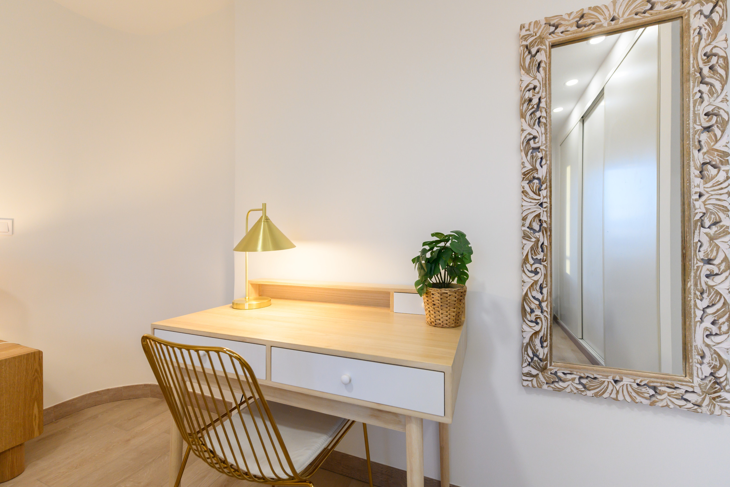• Une seconde chambre avec un lit double, un bureau, des tables de chevet, un grand placard intégré, un miroir, la climatisation et une terrasse privative avec table et chaises, offrant également une belle vue sur la ville. À l'intérieur, une salle de bain complète attenante avec WC, douche, miroir et rangements.
