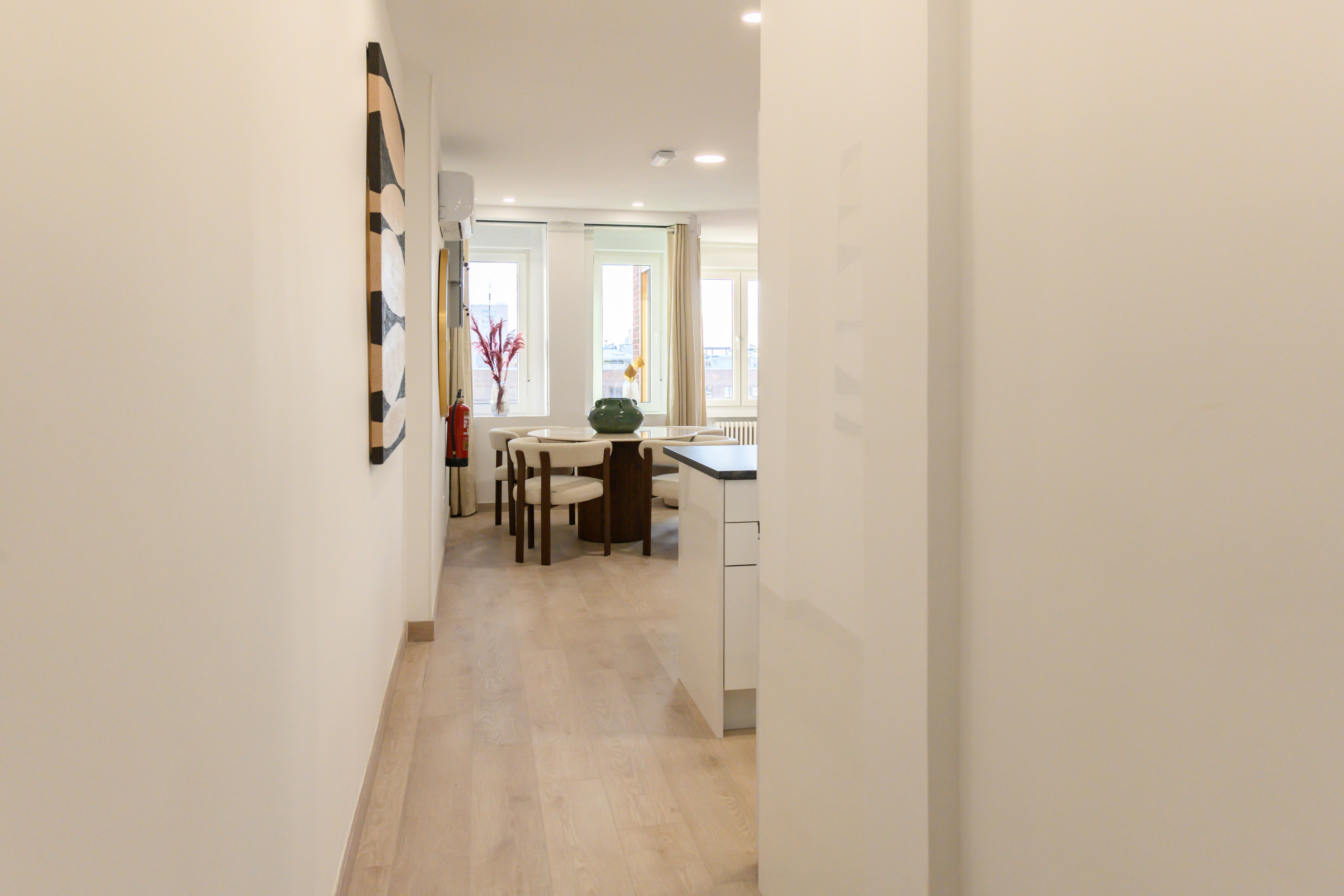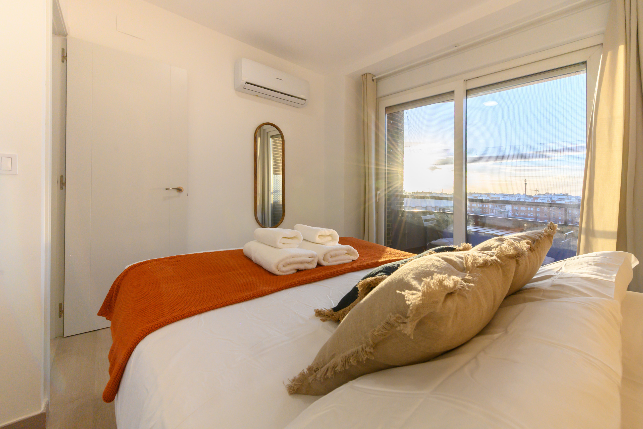 En bref : un appartement spectaculaire et moderne, entièrement meublé et équipé, très lumineux, avec deux chambres et une terrasse privée offrant une vue imprenable sur la ville. Idéal pour un séjour luxueux, confortable, calme et bien desservi à Madrid.