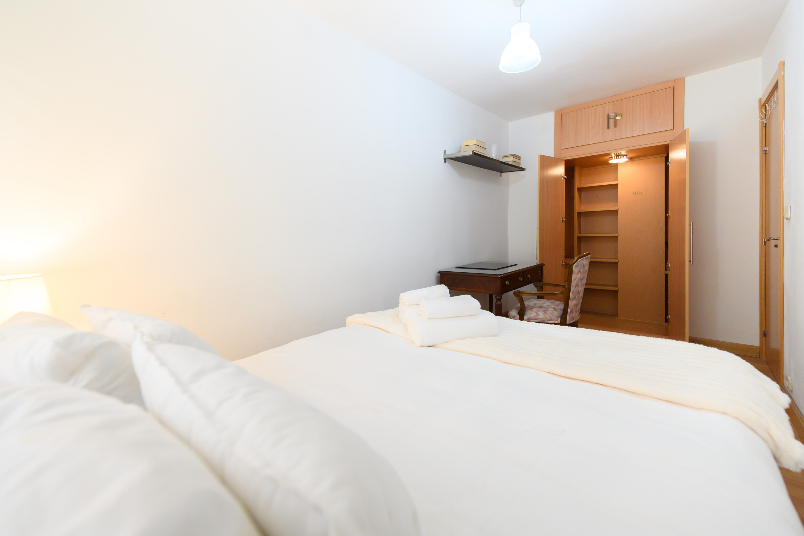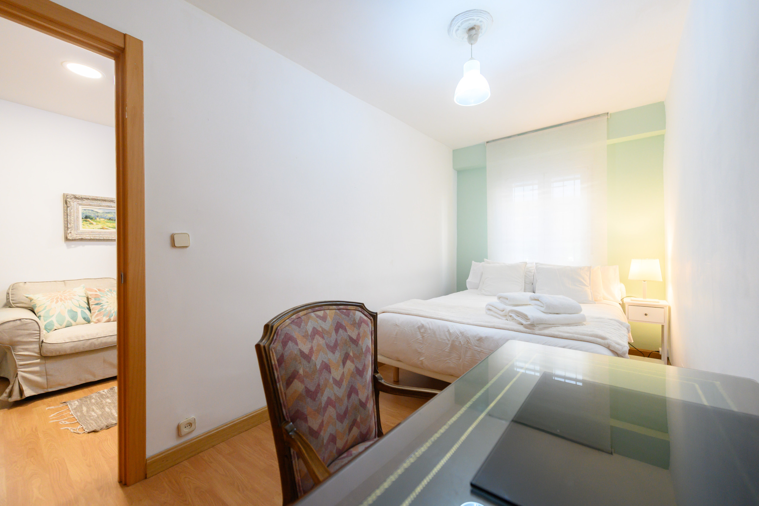 Une chambre avec un lit double et un bureau, parfait pour ceux qui doivent travailler pendant leur séjour. Le salon dispose d'un canapé-lit double confortable et est très lumineux.