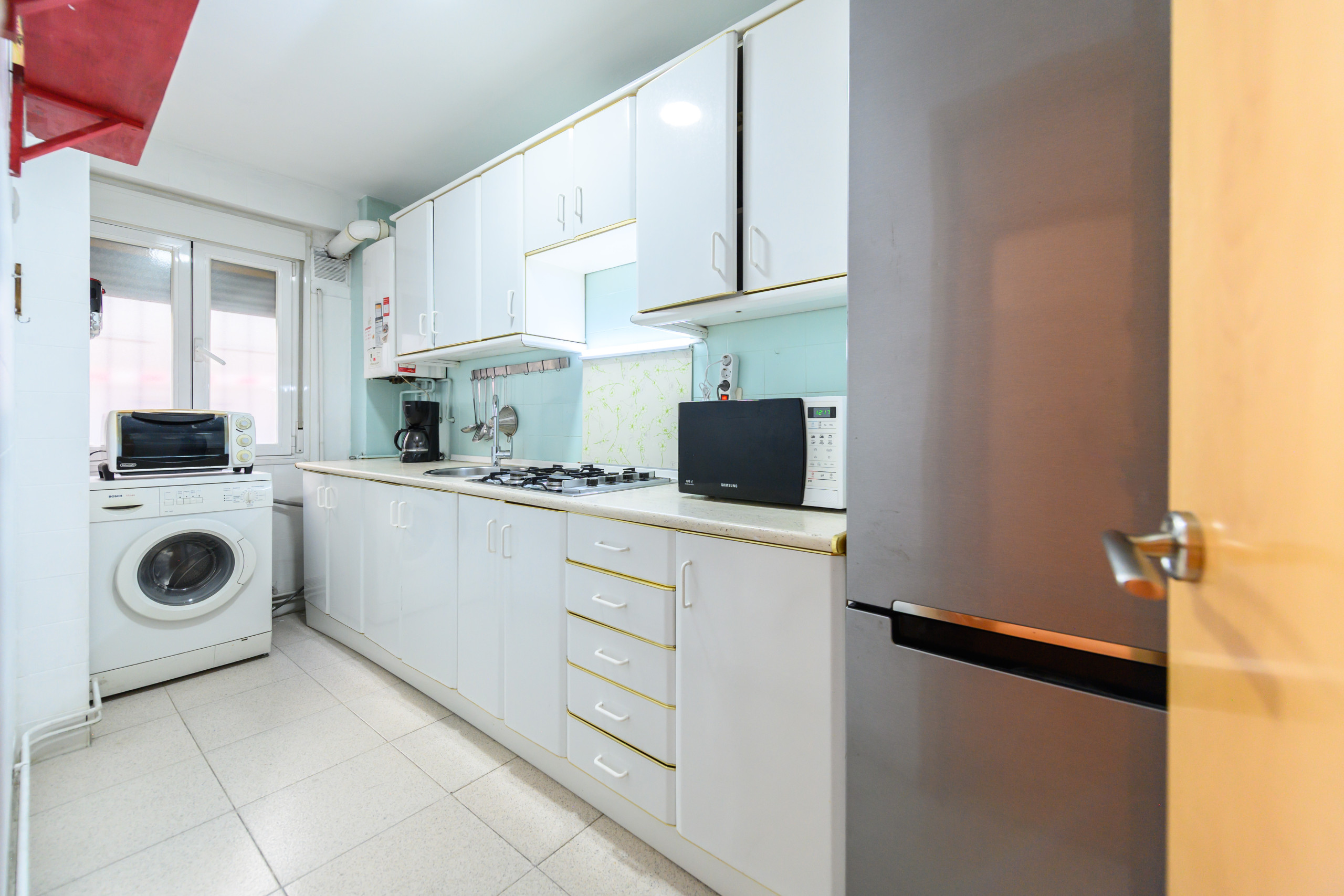 La cuisine, entièrement équipée, comprend un lave-linge, un micro-ondes, un four, une cuisinière à gaz et un réfrigérateur, fournissant tout ce qui est nécessaire pour une utilisation confortable et efficace. Sa disposition facilite l'utilisation de l'espace et l'organisation.