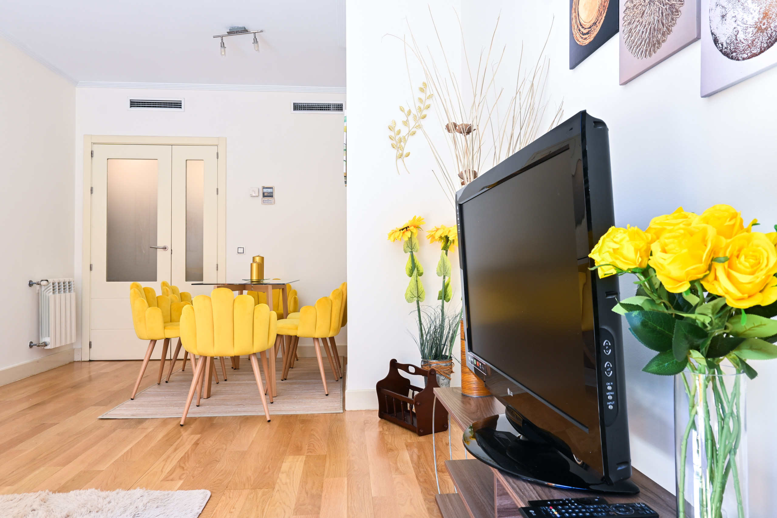 Le cœur de cet appartement est son salon-salle à manger, avec un canapé-lit double pour les invités et une table pour le petit-déjeuner ou le travail, la cuisine ouverte, créant une atmosphère chaleureuse. Cet espace a été conçu pour offrir une zone parfaite pour se détendre et partager des moments avec la famille et les amis. La cuisine est entièrement équipée d'appareils électroménagers et d'ustensiles essentiels, offrant tout ce dont vous avez besoin pour préparer un simple dîner ou un menu plus élaboré.