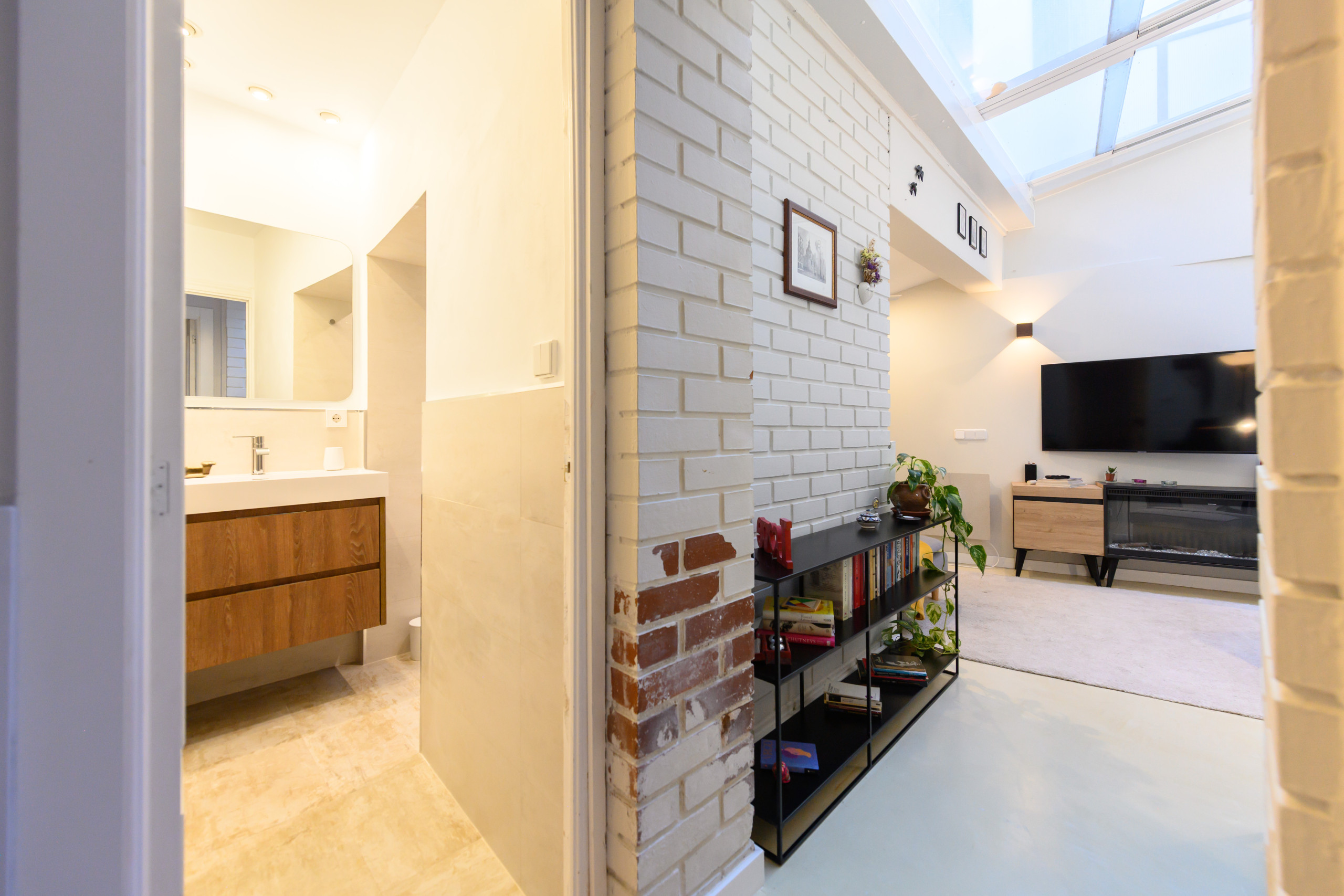 Salle de bain fonctionnelle avec colonne de douche avec accès direct à la chambre à coucher.