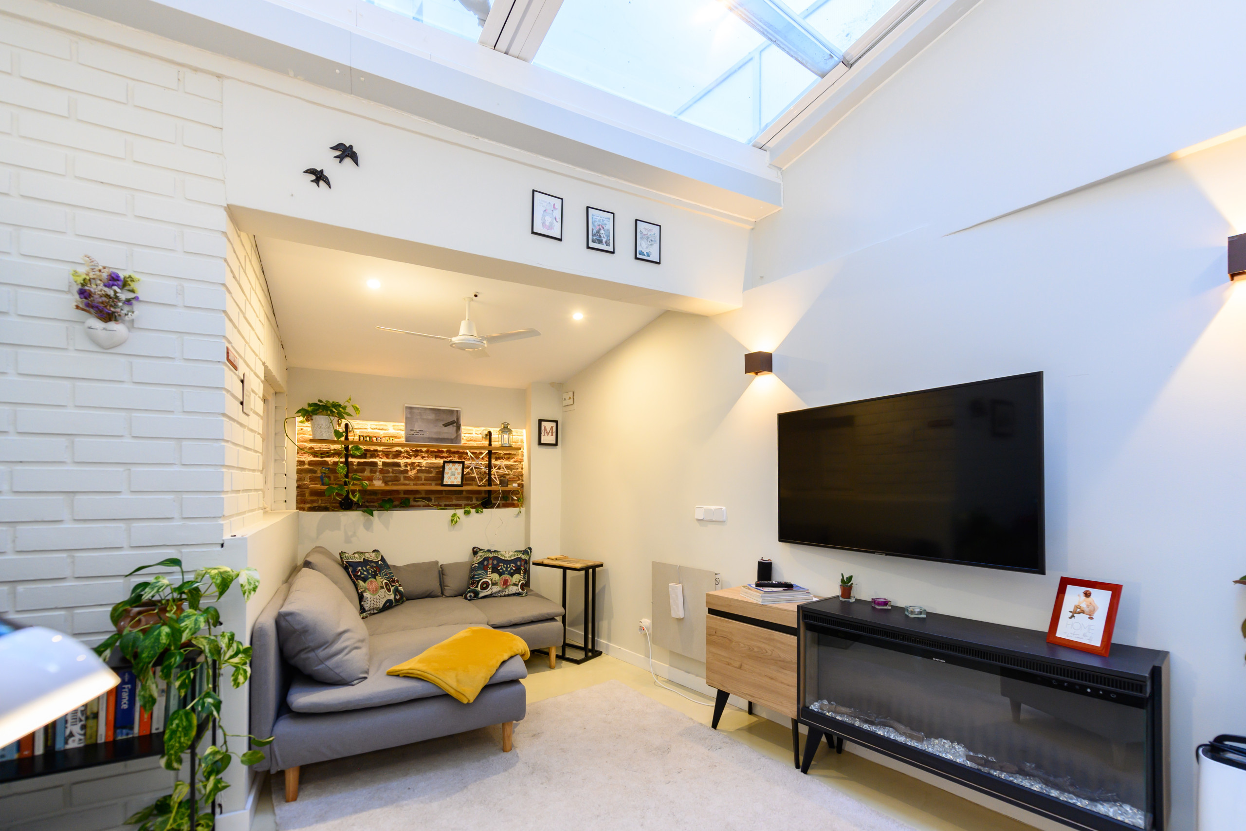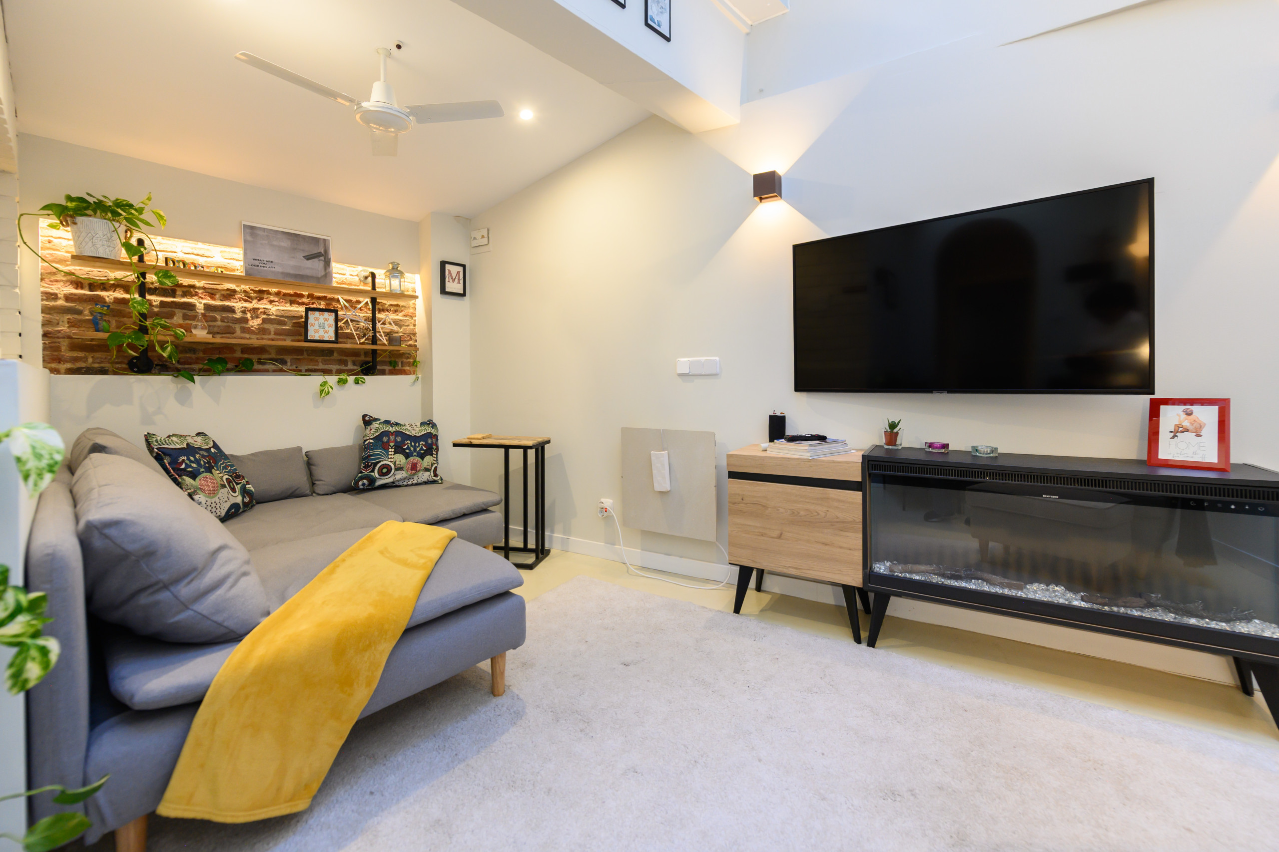 • Un séjour avec canapé, fauteuil, TV, mobilier et de grandes fenêtres offrant une belle luminosité naturelle.