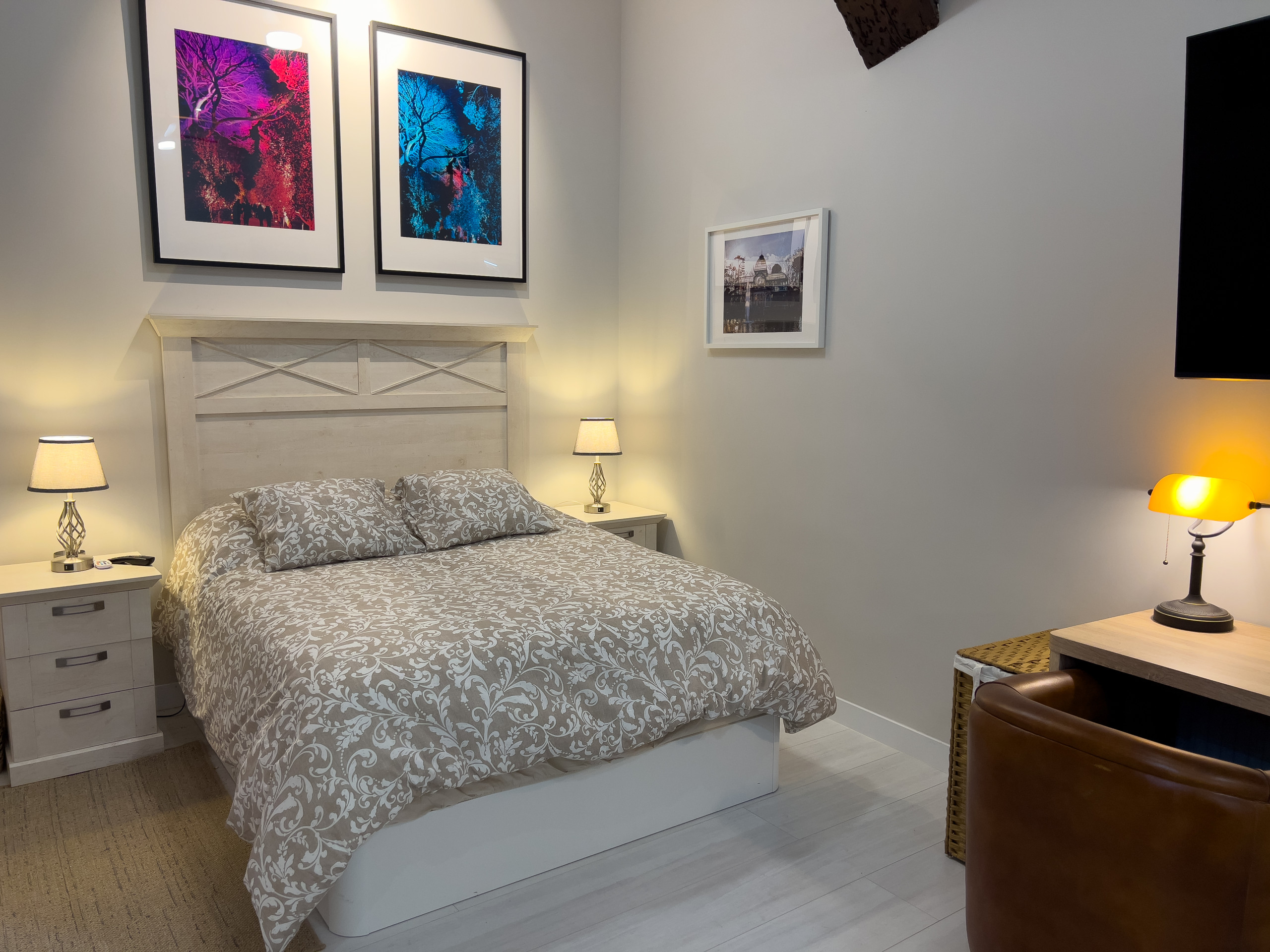 La chambre principale dispose d'un lit double confortable et d'une belle décoration, créant une ambiance relaxante et accueillante. La salle de bain, équipée d'une douche, ajoute une touche de confort à votre séjour.