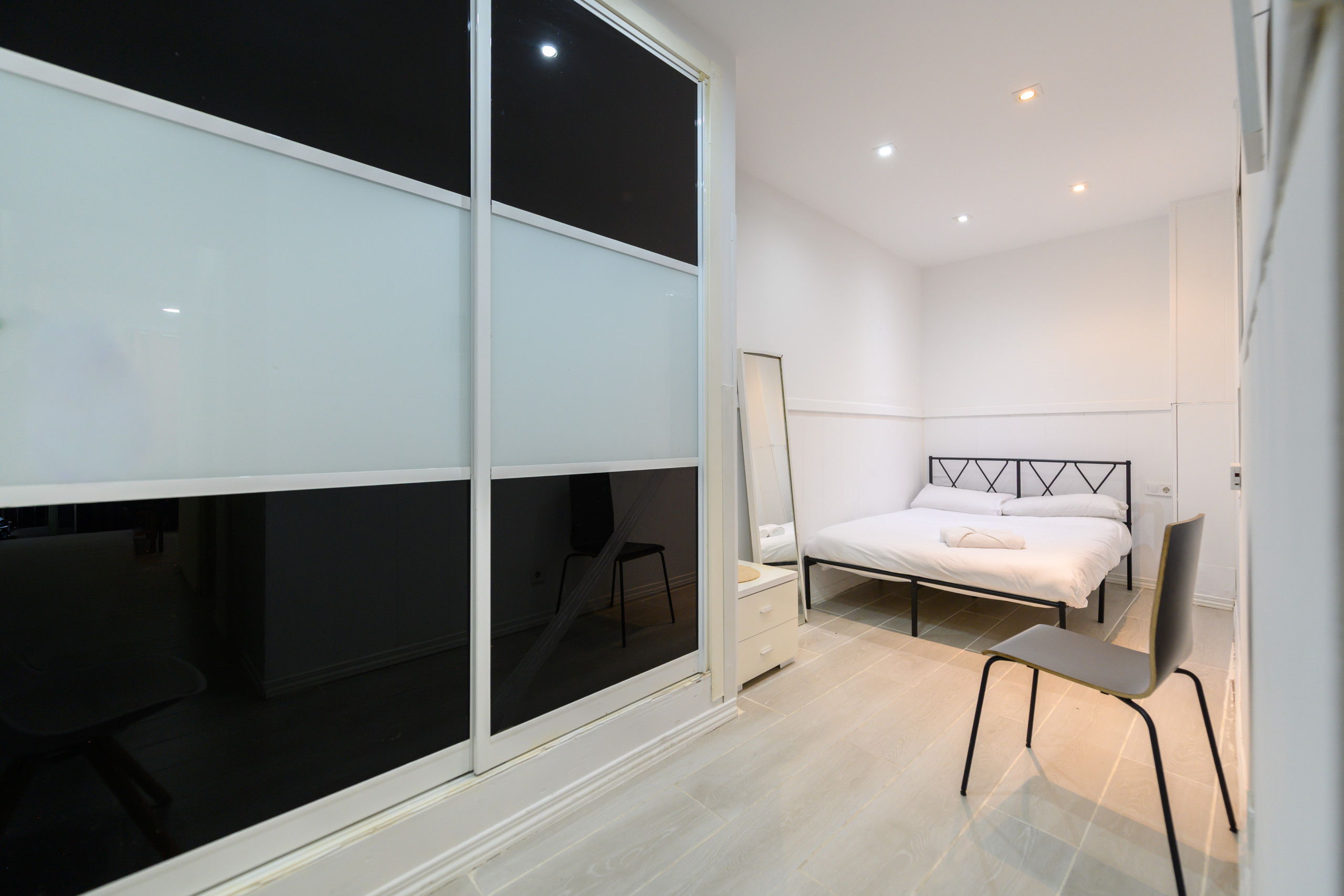 La chambre dispose d'un lit double, d'un placard intégré et d'un miroir, offrant un espace ordonné et pensé pour le repos.