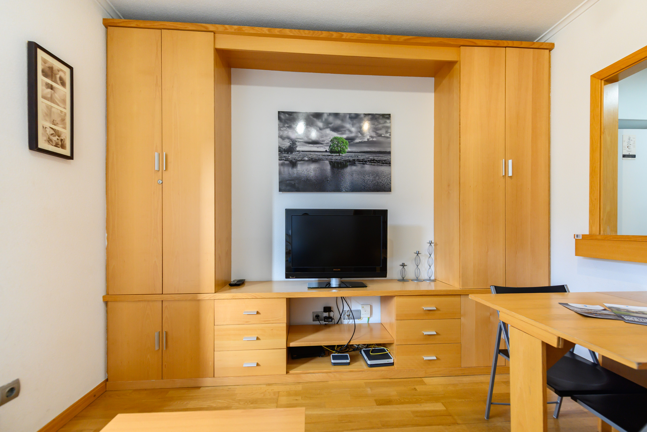 • Un salon spacieux, meublé d'un canapé-lit, d'une télévision, d'une armoire, de rangements, d'une table à manger et de grandes fenêtres avec une vue agréable.