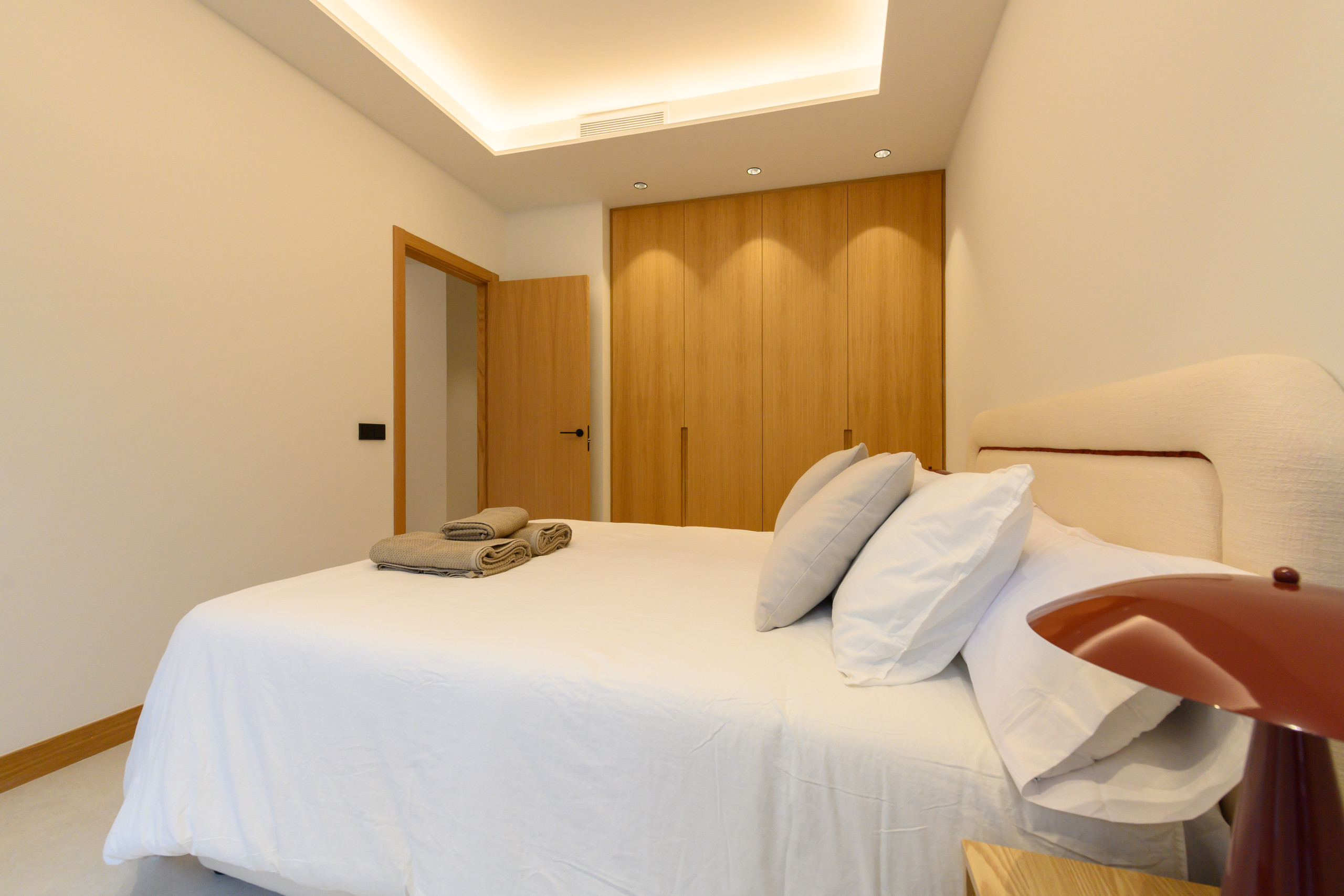 • Chambre principale avec lit double, deux tables de chevet et une grande armoire encastrée.
