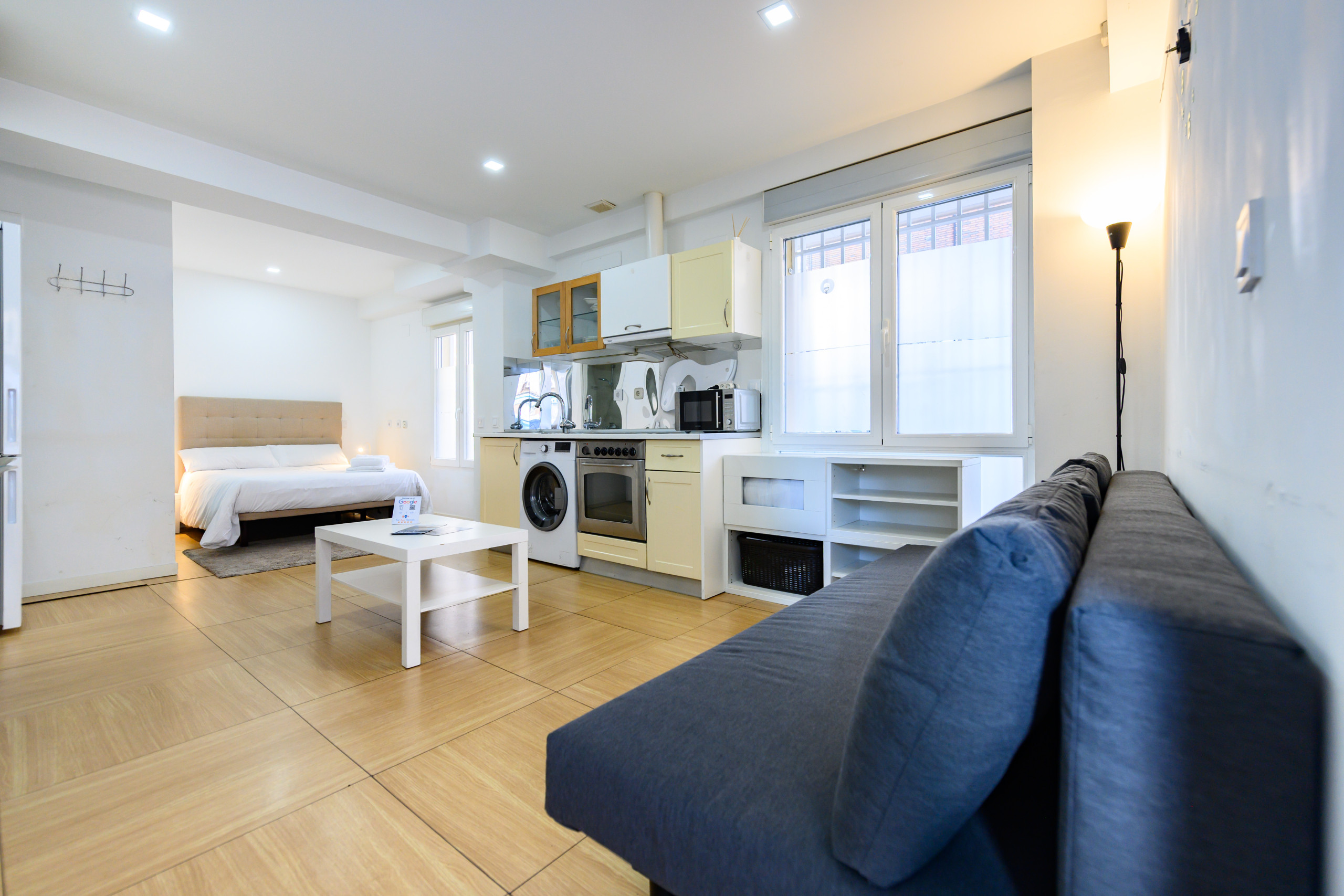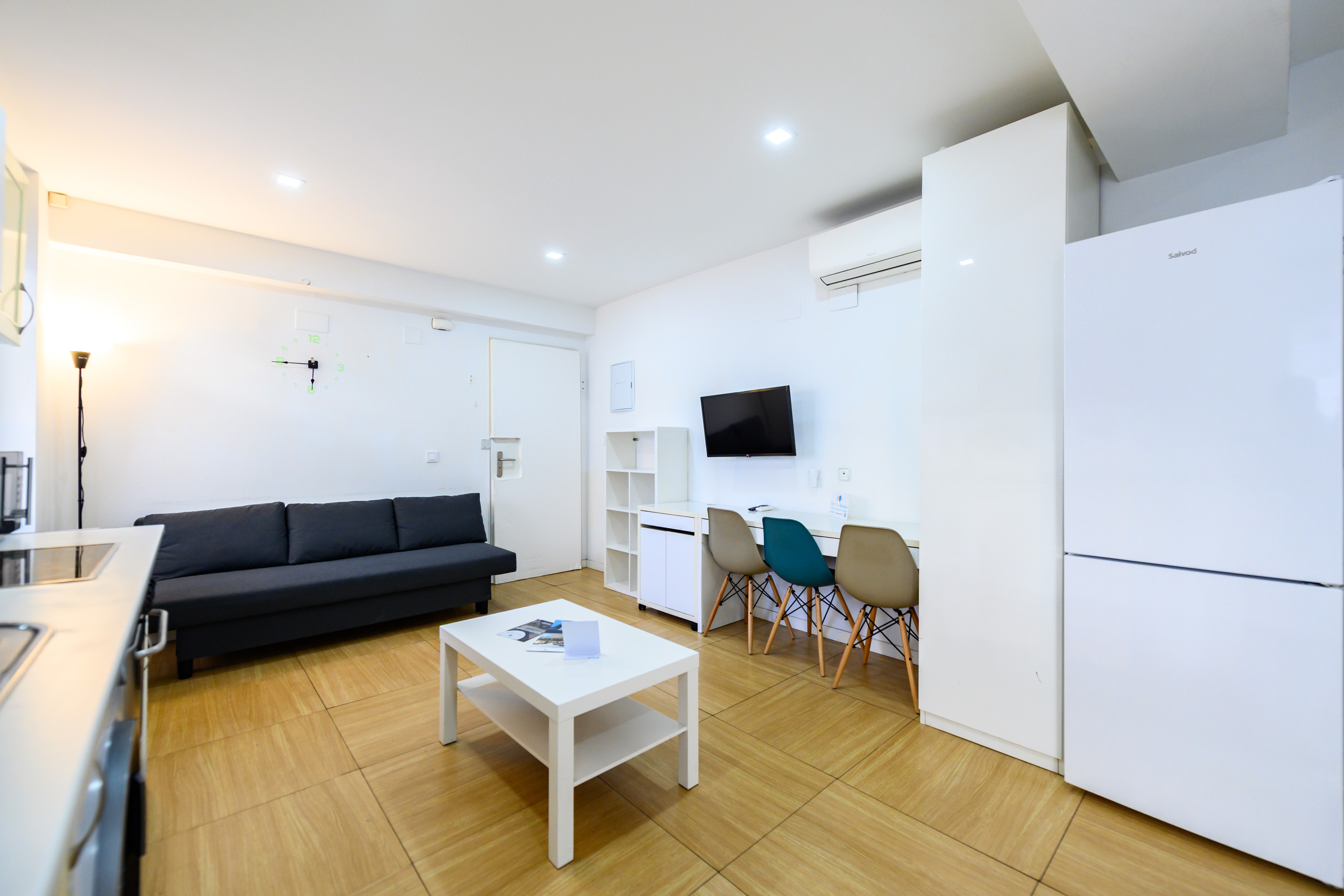 Location temporaire. Studio confortable de plain-pied situé rue Santiago de Masarnau, dans le quartier de Ciudad Lineal. Idéal pour un séjour professionnel, des études ou pour profiter de Madrid en famille ou entre amis. L'appartement se trouve dans un quartier résidentiel calme, bien desservi par les transports en commun.