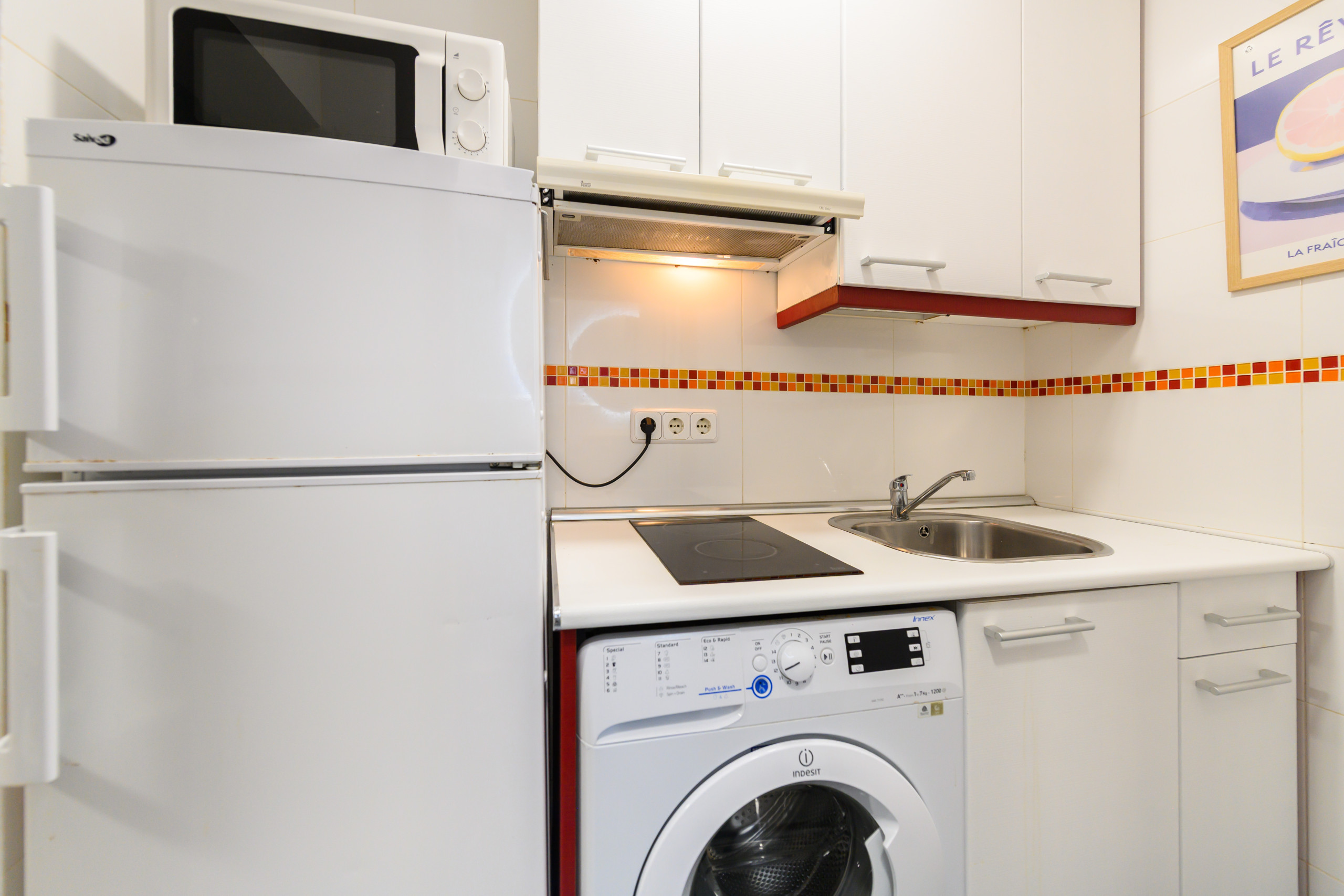 Cuisine : La cuisine, bien que petite, est entièrement équipée de tout ce dont vous avez besoin pour cuisiner vos plats préférés. Il dispose d'une plaque vitrocéramique, d'un réfrigérateur, d'un four micro-ondes.