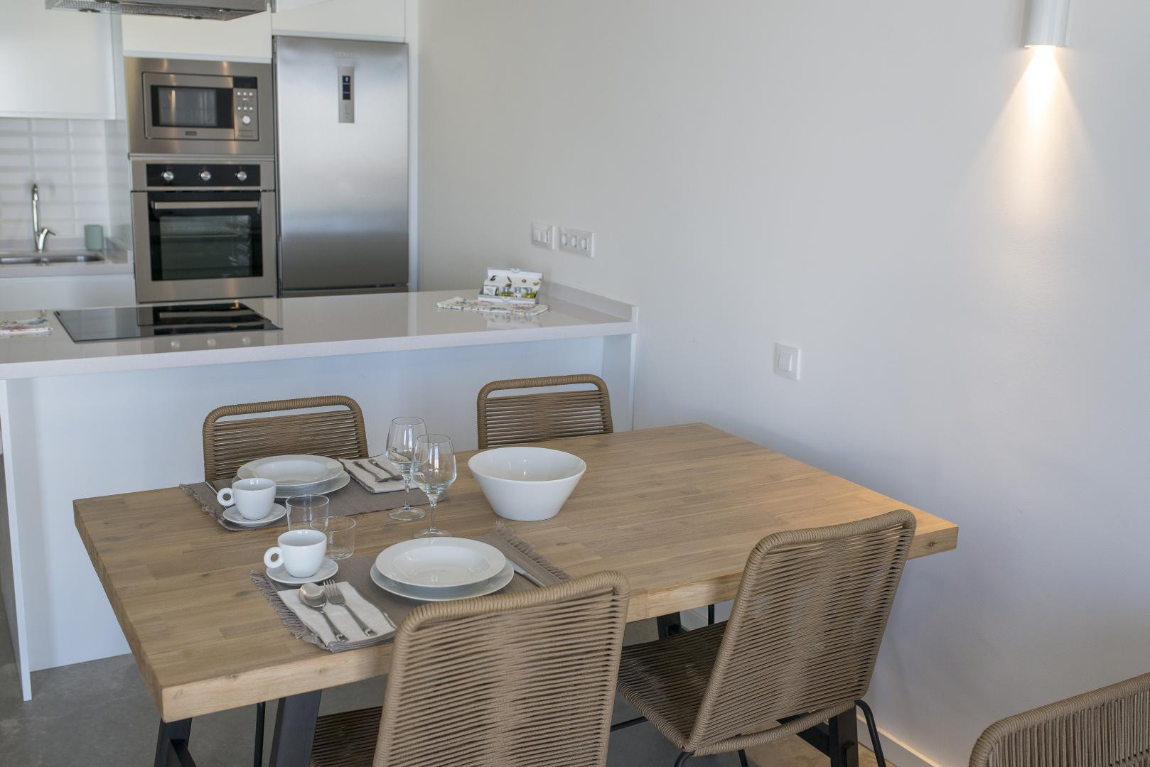 La cuisine américaine, à vitrocéramique, est équipée avec réfrigérateur, micro-ondes, four, congélateur, vaisselle/couverts, ustensiles/cuisine, cafetière et bouilloire.