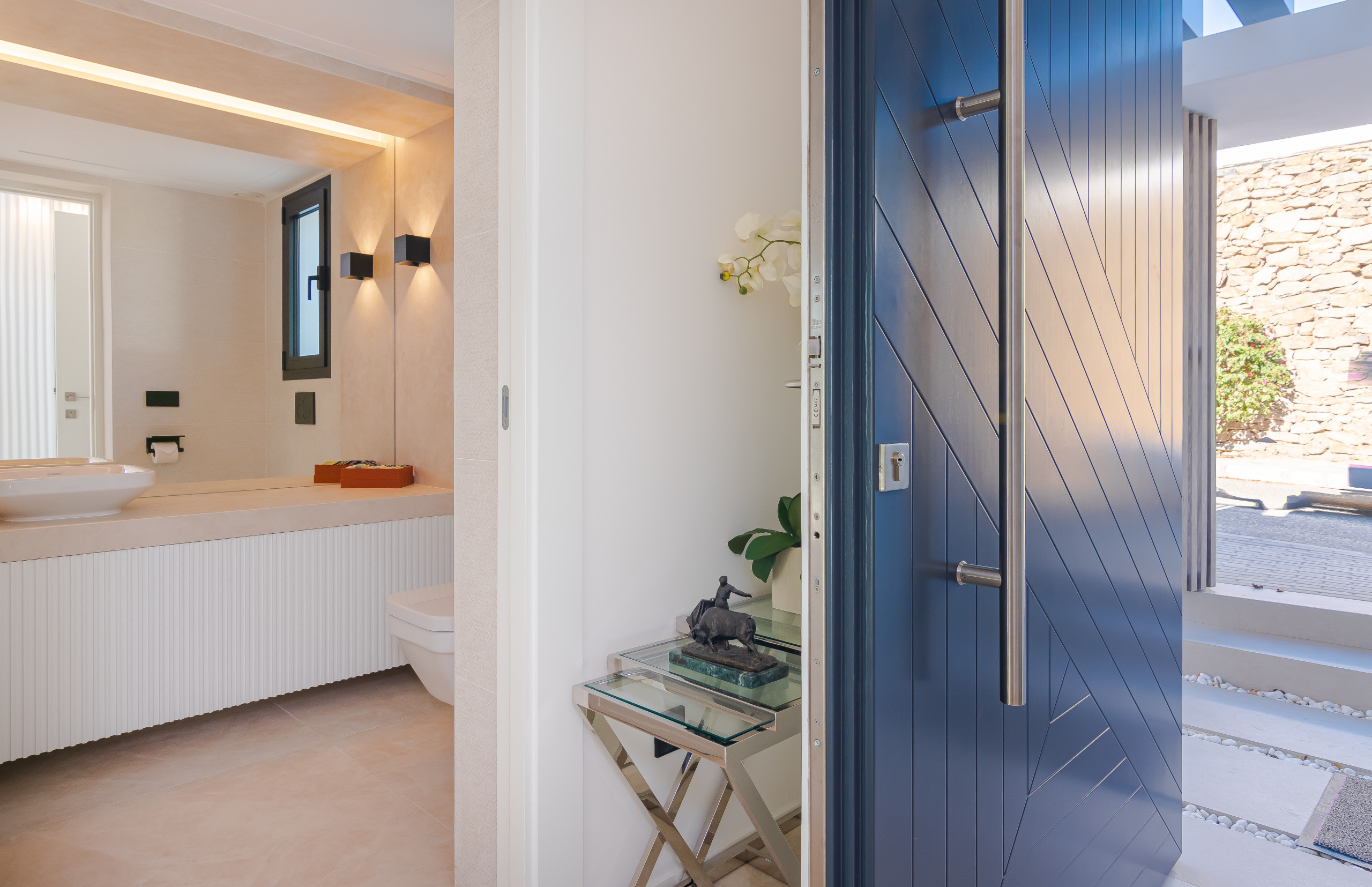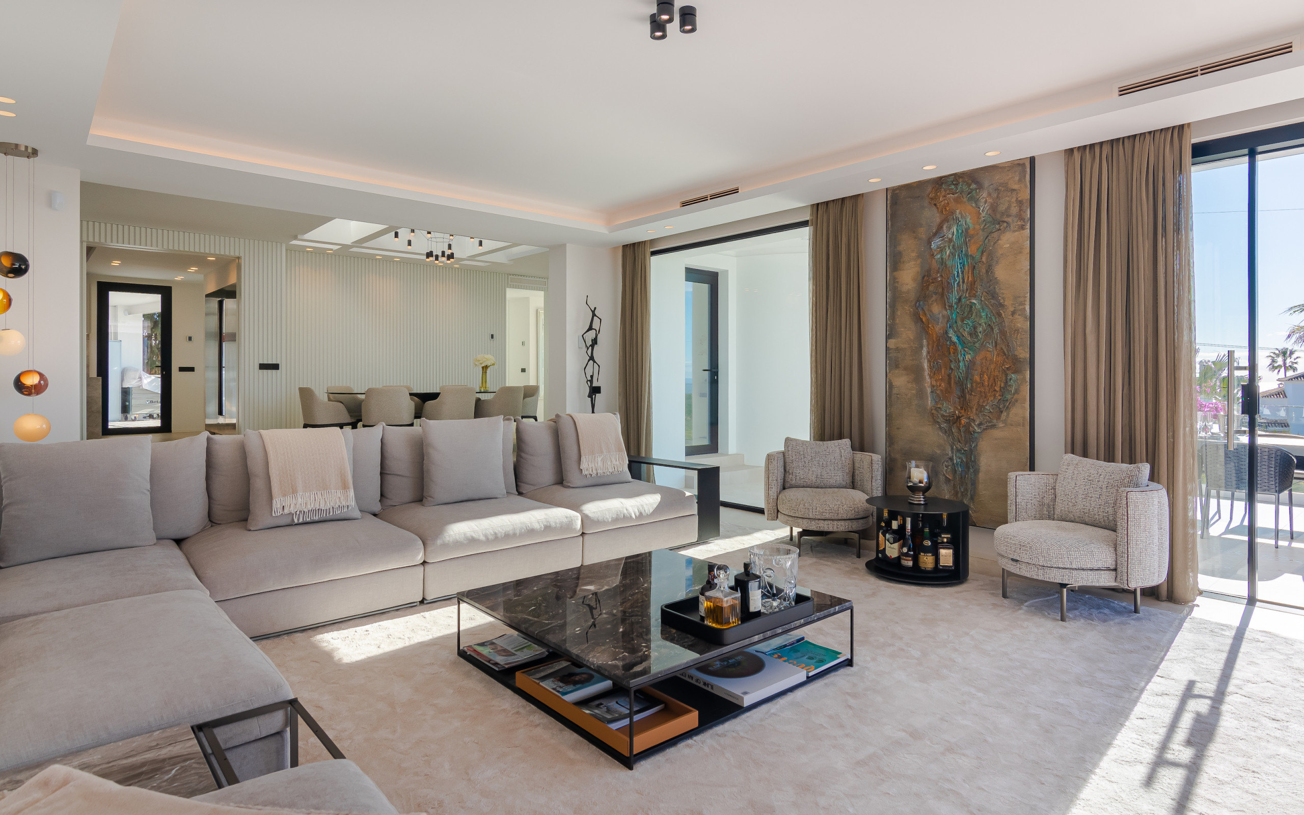 Par la porte principale vous entrez dans un hall spacieux avec accès direct à la salle à manger belle et lumineuse. Pour la droite, vous trouverez une vie fantastique avec téléviseur grand écran et tout l'équipement nécessaire HIFI.