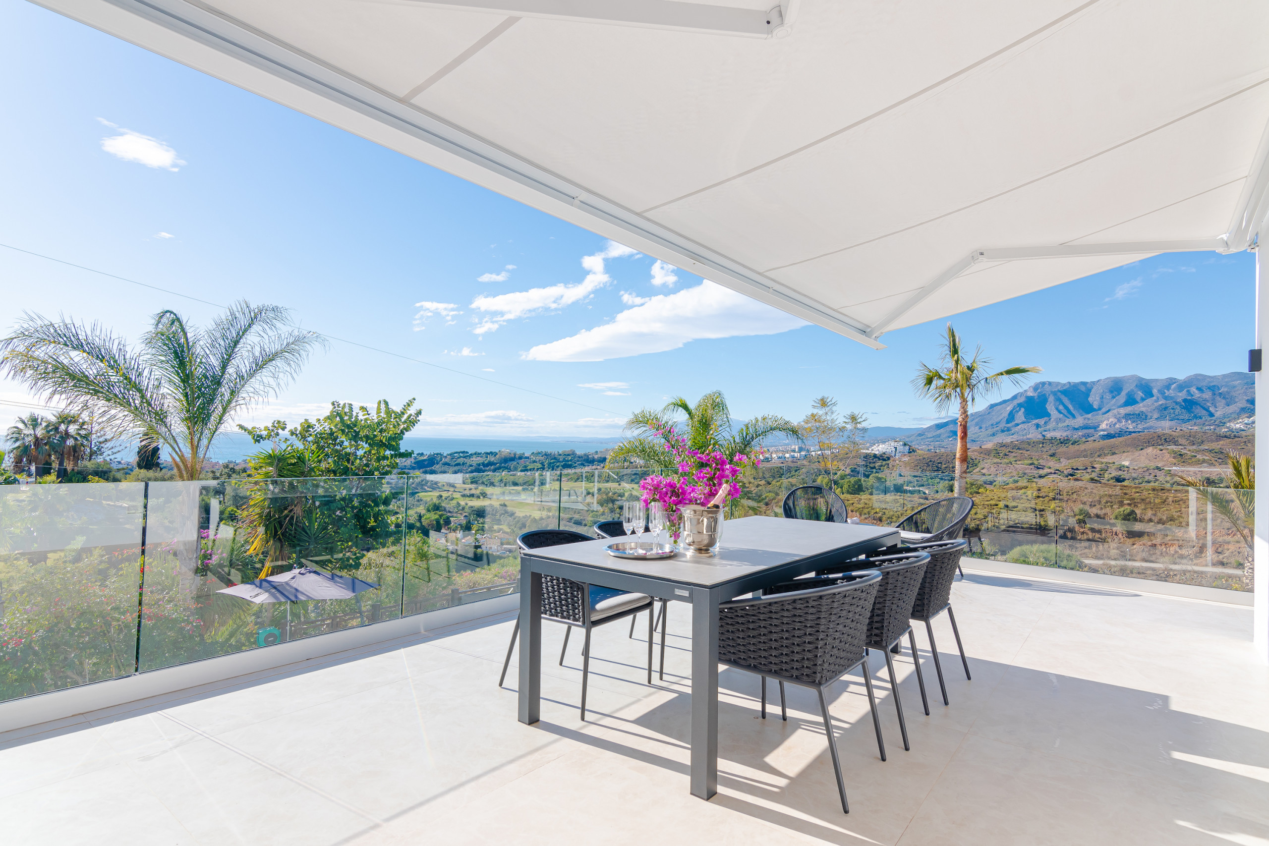 En passant la salle à manger vous avez accès à la terrasse à votre droite avec table à manger pour 4 et un coin salon pour 8 personnes. Les points de vue de la terrasse sont incroyables et les environs sont très calmes.